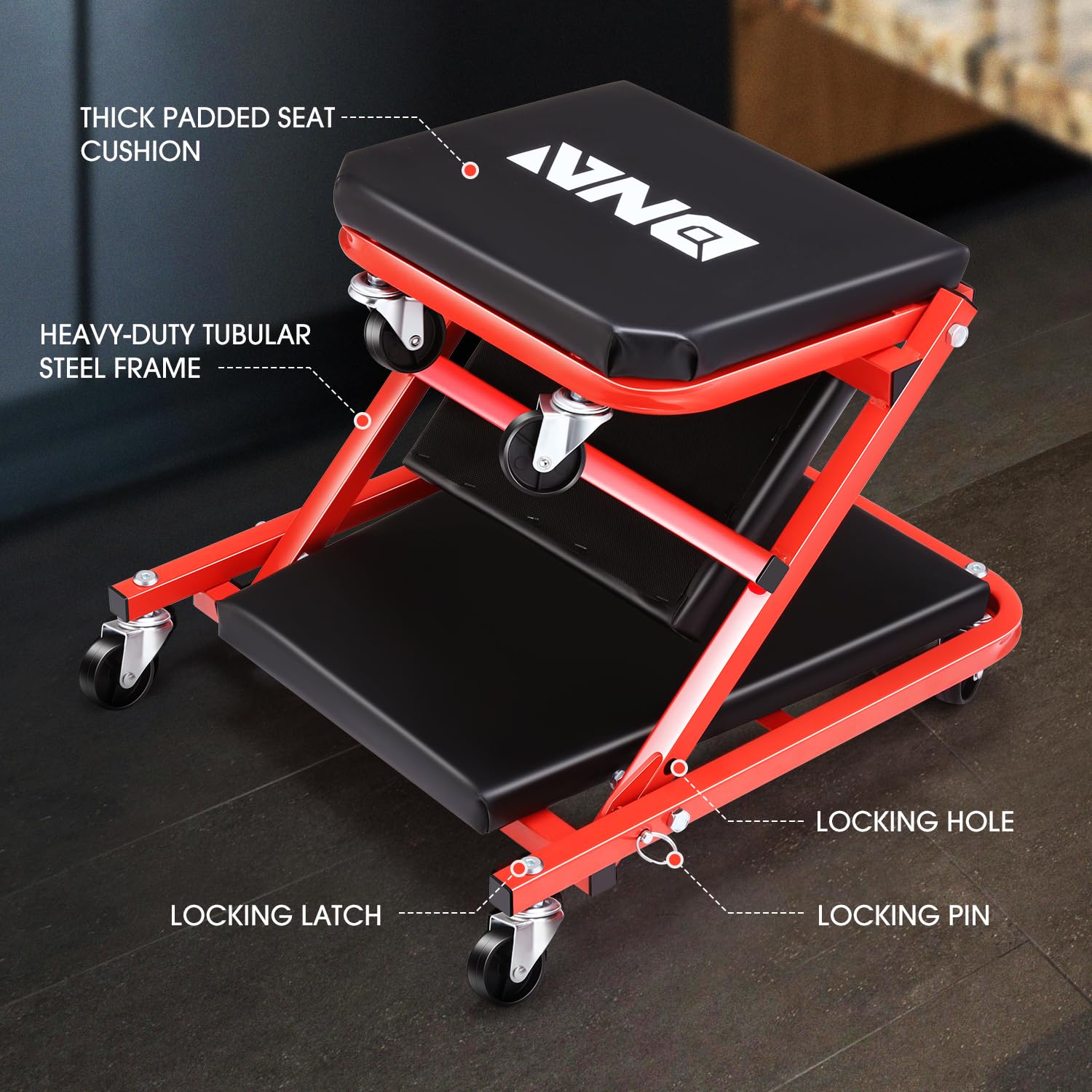 - ADVANCED DESIGN - This roller garage shop creeper with thick padded seat cushion will provide stability and comfort on the job. Unique design allows creeper to transform from a standard rolling creeper into a seat in seconds.