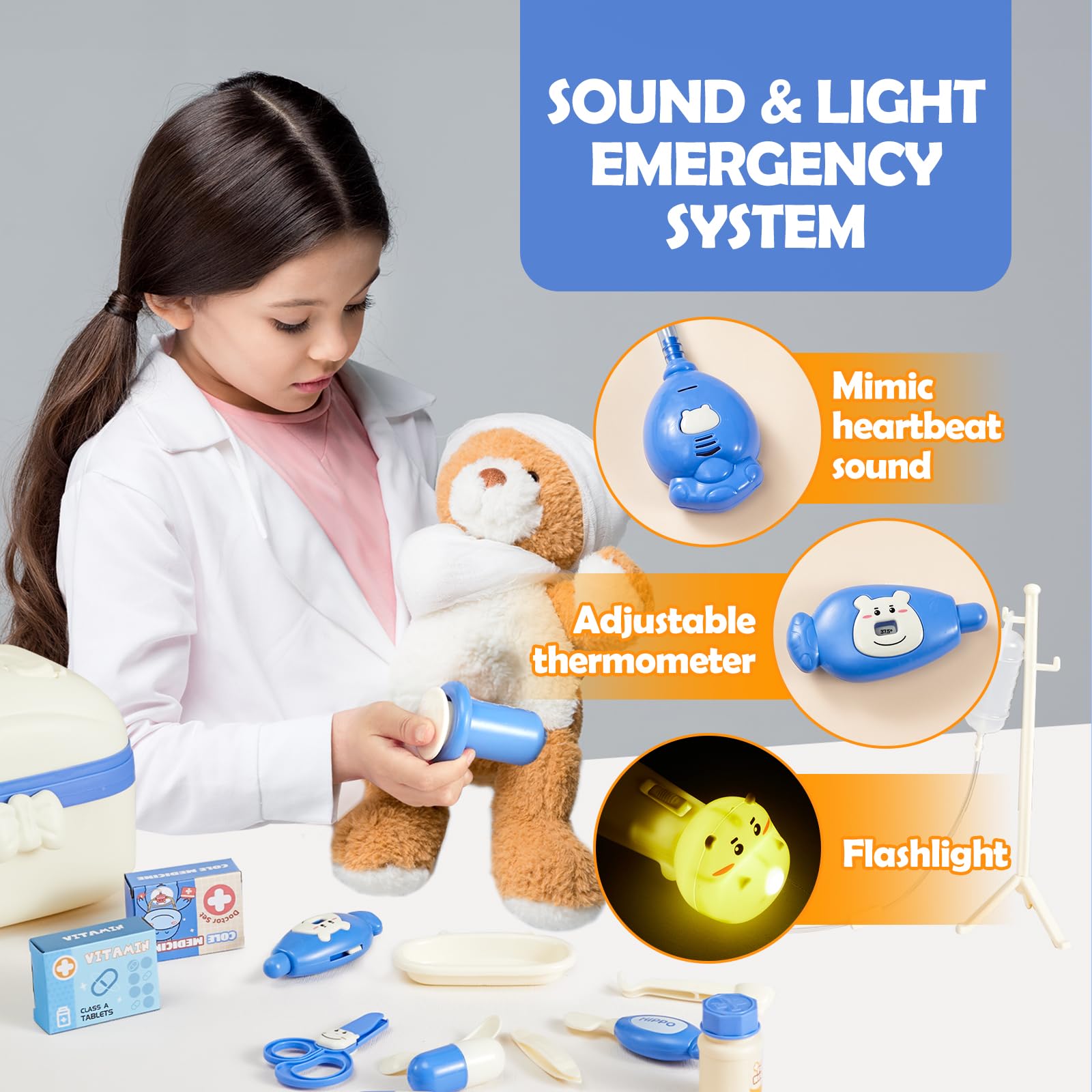 - Next-Level Realism: Watch your kids' faces light up as they press the electronic stethoscopes for nurses to hear heartbeats. Toddler dress up like a real doctor The thermometer, otoscope, and flashlight all light up, making playtime incredibly lifelike.