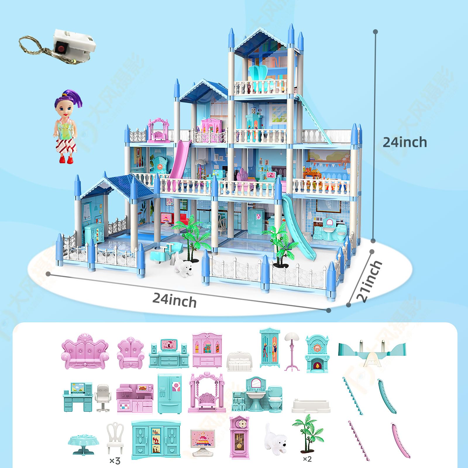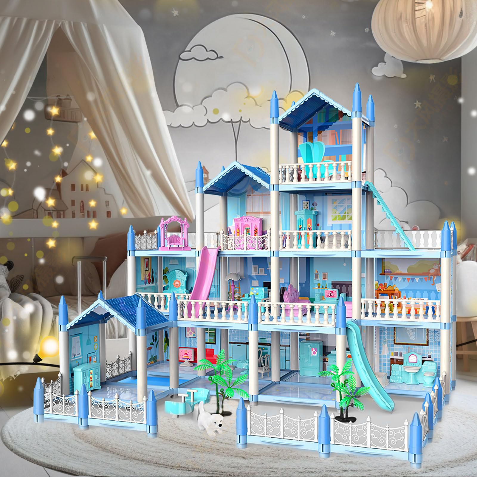 Doll House, Dream Doll House Girls Toys, 4 Story 14 Rooms Dollhouse with 4 Dolls, Dollhouse Furniture Accessories with Light, Toddler Playhouse Gift for 3 4 5 6 7 8 9 10 Year Old Girls Toys (blue04)