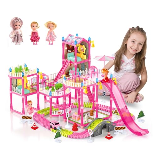 - 【 Unique Furniture Accessories 】: The doll house comes with tons of furniture and accessories, including sofas, closet, beds, tables, chairs, cars, 2 pets, 3 dolls, pet house, slides, stairs, fences, and more. Especially, a track can be installed in the middle of the house for cars to run on. Let children participate in DIY design and decoration to release their creativity.
