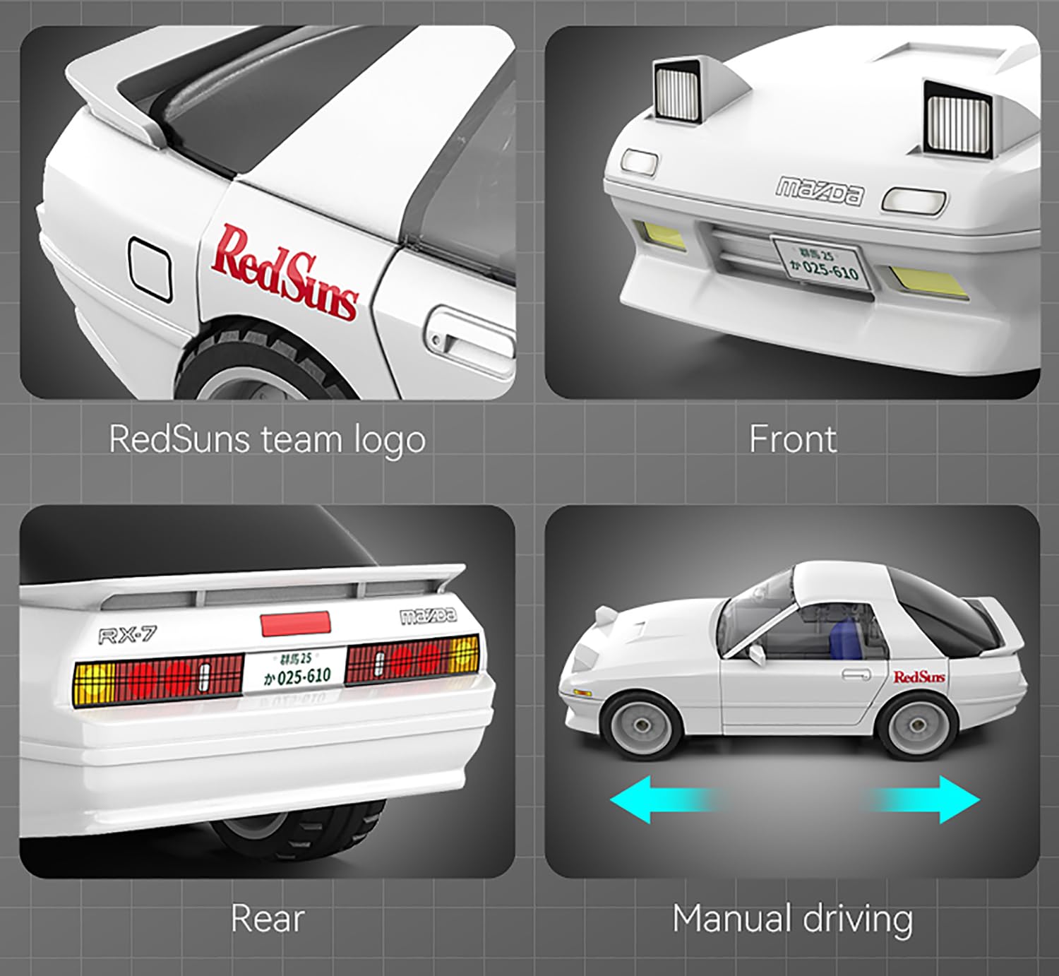 - This 1:35 scale car model to build offer entry-level brick building for casual enthusiasts of the Initial-D manga and car lovers. Fans can easily collect Ryosuke Takahashi’s Mazda RX-7 FC3S for display and casual building.