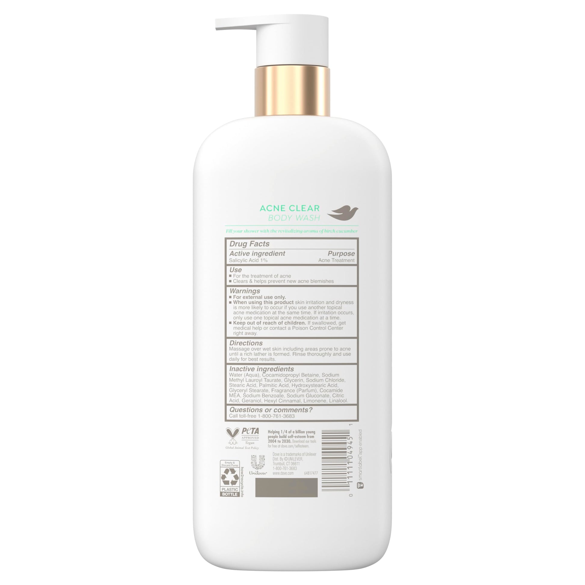 Details: New Dove Acne Clear Body Wash, with 1% clearing salicylic acid, deeply cleans your skin while purifying pores to reduce and help prevent acne breakouts. Watch as this clear, refreshing gel body wash transforms into bubbly lather, while filling your shower with fresh & herbal notes. Has your skin been missing out? New Dove Serum Shower Collection is infused with active skin care ingredients to supercharge your body care routine. Quench thirsty skin with hydrating serum + hyaluronic acid, help prevent acne with acne clearing salicylic acid treatment, or recharge skin’s glow with brightening serum + vitamin C. Dove teamed up with leading dermatologists and beauty experts to create a new shower collection that brings expert skin care into your shower. Infused with the ingredients you already love using on your face (hello, hyaluronic acid!), these body washes, scrubs and beauty bars care were created for your unique needs. Because we think beautiful, visibly healthy skin is a head-to-toe kind of thing. Dove is the Dermatologist recommended body wash brand. This cleanser is made with naturally-derived gentle skin cleansers, no sulfates or parabens and is PETA-certified vegan.