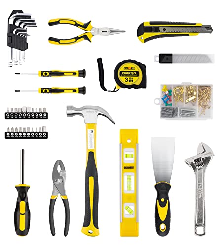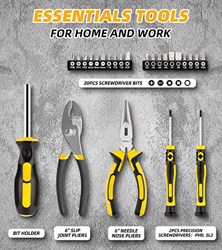 - 【146 PCS HOUSEHOLD TOOL KIT】Comes with almost every basic hand tools you need for work and DIY projects around the house.Includes slip joint pliers, groove joint pliers, adjustable wrench, long nose pliers, magnetic screwdriver holder, screwdriver bits, utility knife, tape measure.