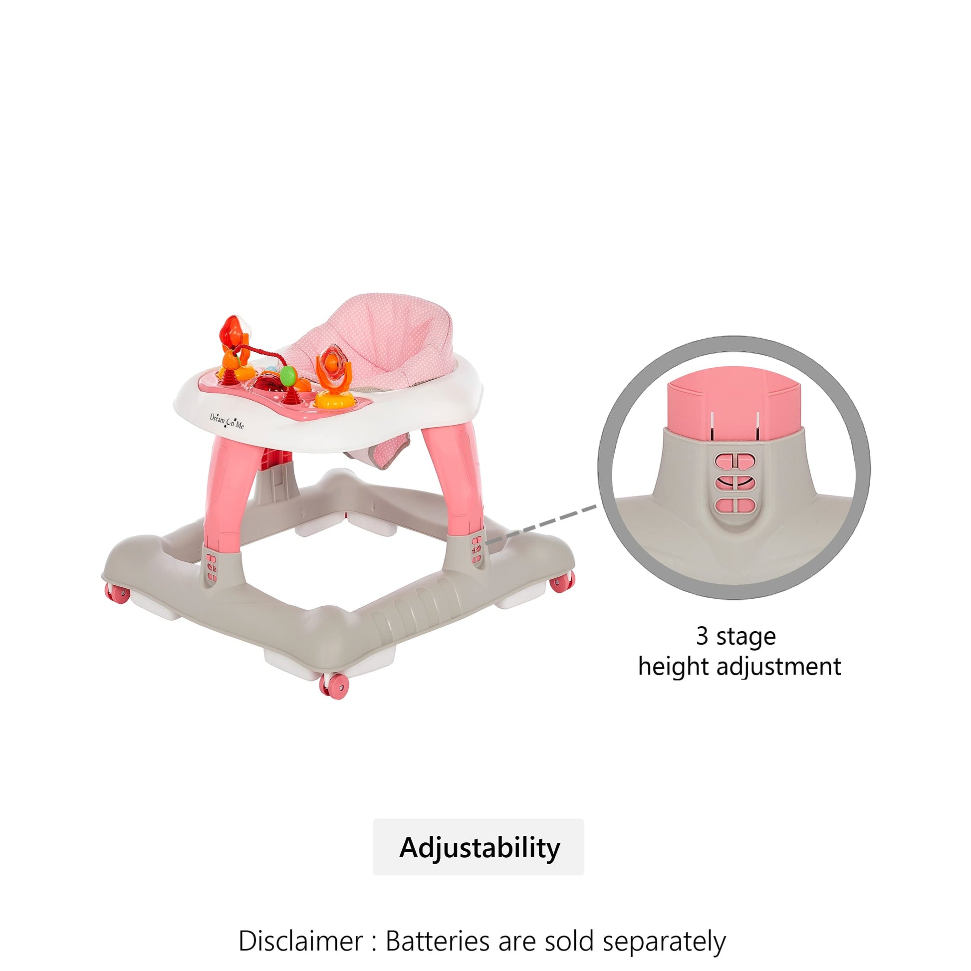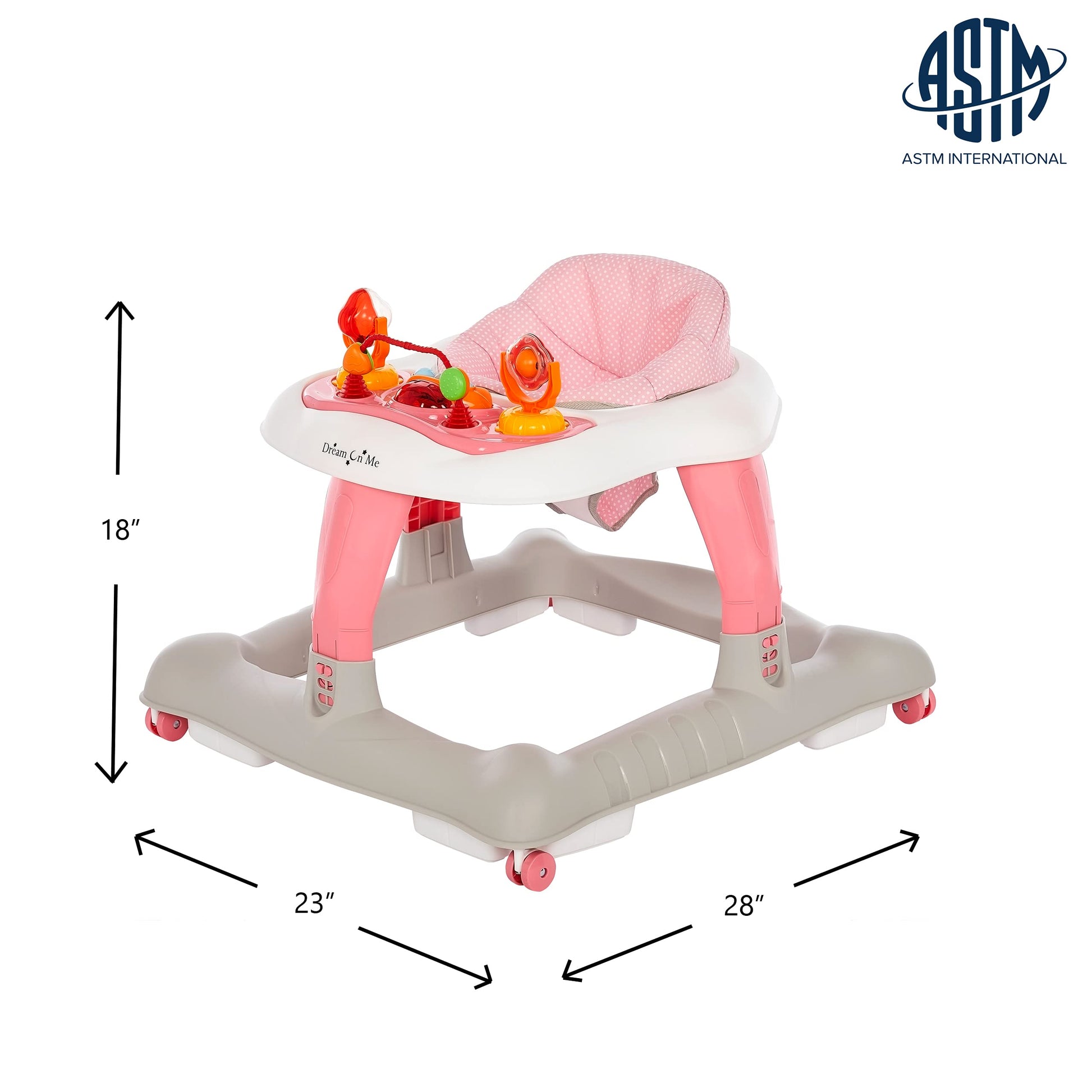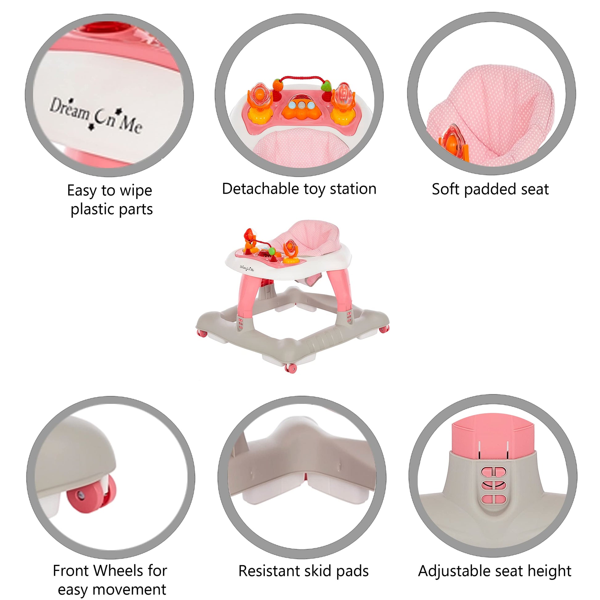 Details: Help your baby discover the fun world of walking with the Dream On Me Explorer Baby Walker. Here’s why it makes for the ideal transition to walking tool - it comes with a 3-position height adjustment to keep pace with your little one’s rapidly lengthening strides!The Explorer features a soft, padded seat pad. And while sitting, your child can play with the toys on the detachable toy station. Both are removable, which means cleaning up any mess is never a problem! There’s also an attached toy tray in which your child can play with toys of their choice! The Explorer comes in three attractive colors and trendy patterns.The Explorer conforms to ASTM F977 standards.Its sturdy wheels are equipped with grip strips that not only make it secure but also allow for a smooth ride on hard floors or carpeted surfaces.Product specs are 28Lx23Wx18H inches and it weighs 9 lbs. Needs 2 AA batteries (not included) Can accommodate a child 6 months and older and maximum weight limit is 25 lbs.