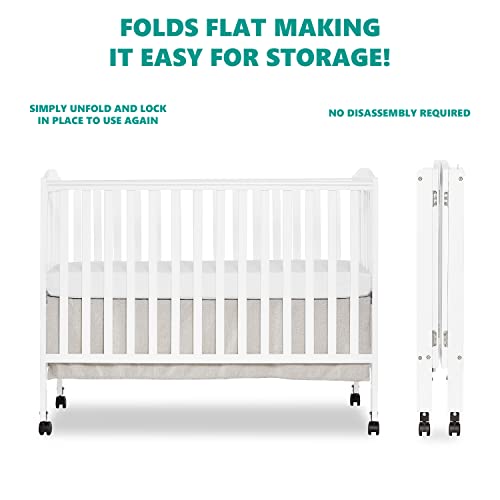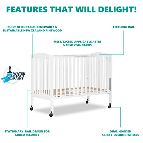 Details: Product Description With its compact folding system, the Dream On Me Full Size 2-in-1 Folding Stationary Side Crib is ideal for small spaces! It has a convenient 2-position folding crib. Once your child outgrows it, the patented folding system allows you to fold it without disassembly and store. It’s lightweight and mobile and folds flat for storage - compact and perfect for small spaces. Simply unfold and lock in place for when you need to use it again, like when guests with babies visit, or use it in grandma’s house! The crib features a contemporary design with clean lines and comes with a teething guard. It is available in six beautiful finishes, perfect to suit any nursery theme you pick! All tools for assembly are provided. We prioritize safety. Our cribs meet/exceed applicable ASTM & CPSC standards. Enhanced safety features include the stationary rail design (non drop side) and dual safety hooded locking wheels. Product dimensions are 54Lx31Wx46H inches, maximum weight limit 50 lbs. We recommend the Dream On Me non-toxic, Greenguard Gold certified full-size crib mattress (sold separately) for the perfect fit. All tools for assembly provided. From the Manufacturer The Dream On Me, full size folding crib is the only full size, 2 position folding crib available. The United States patented design makes folding easy for flat, convenient storage when not in use. It features a stationary (non drop side) rail design which provides the utmost in product safety. It has dual safety, hooded locking wheels, beautiful non-toxic finish and is made of Pinewood. All tools for assembly included. Mattress sold separately.