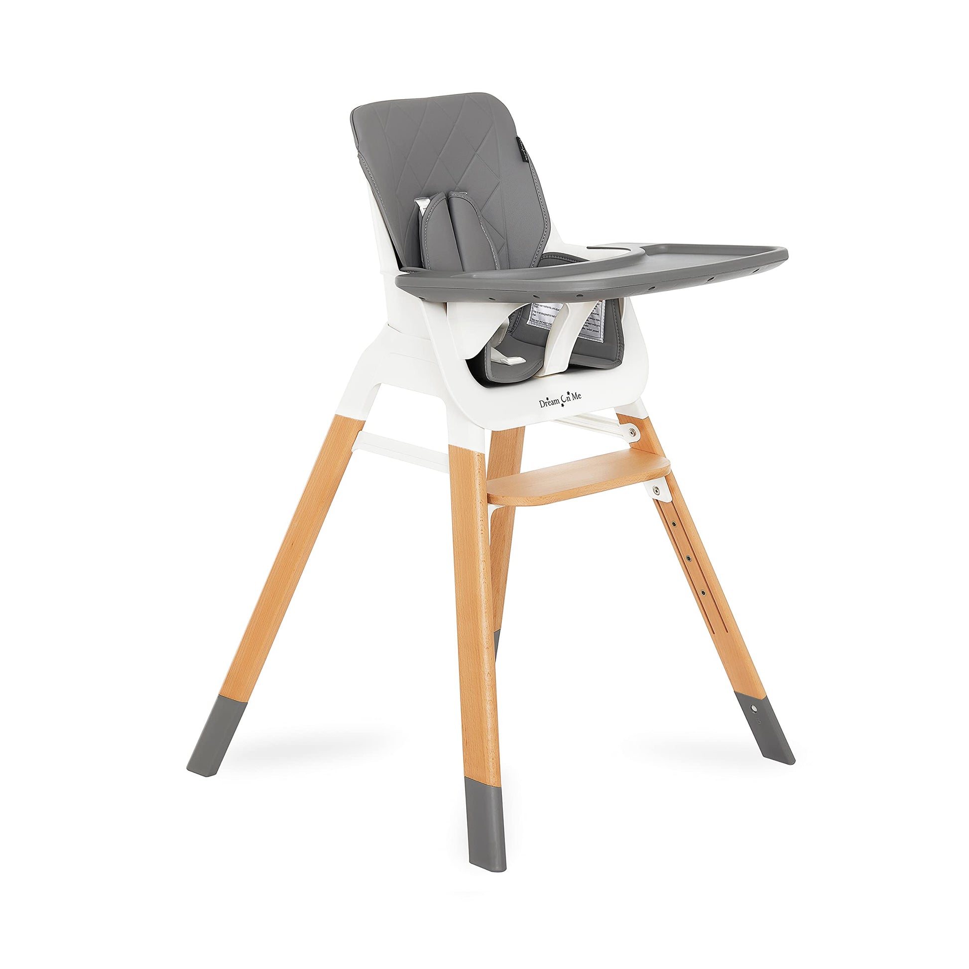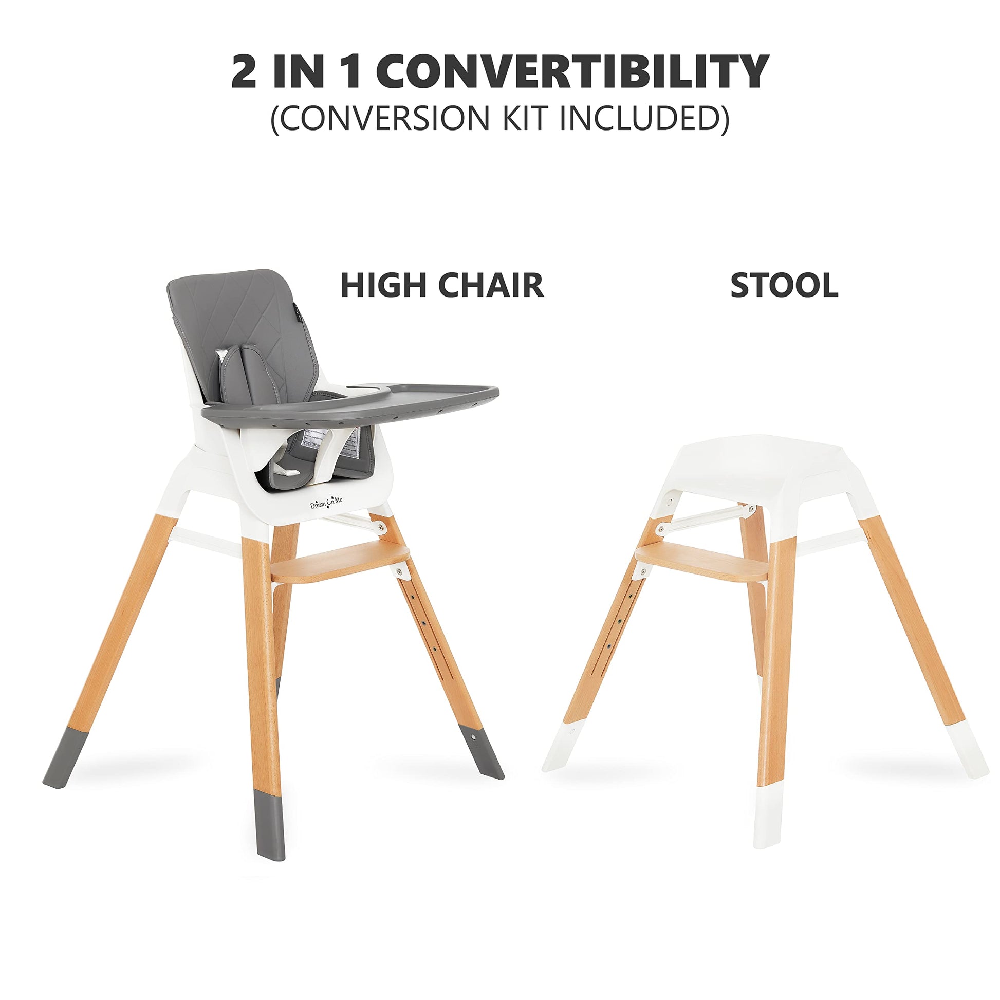 Details: Happiness is watching your baby try their very first foods. Mealtime with babies is about more than just eating. Besides learning all sorts of social and cultural norms, it is some of their first active sensory play. Keeping all this in mind, Dream On Me parents have voiced their desires for a trendy, functional high chair and the result is our “Nibble Beechwood Highchair. This multifunctional highchair is made from a sleek beechwood which is aesthetically pleasing, straight grained hard wood used in making furniture as well as hygienic food grade PP material. The comfy, padded seat is made of PU fabric, which is extremely durable, lightweight, and non-toxic. It offers a super-sized removable tray, adjustable 5-point safety harness and 4 position adjustable foot rest. Have your baby experience mealtime stress free, in comfort and with confidence. As an added bonus, the high chair can easily convert to a bar stool to use around the house for multiple functions. The highchair meets or exceeds the newest ASTM F 833 18 standards.