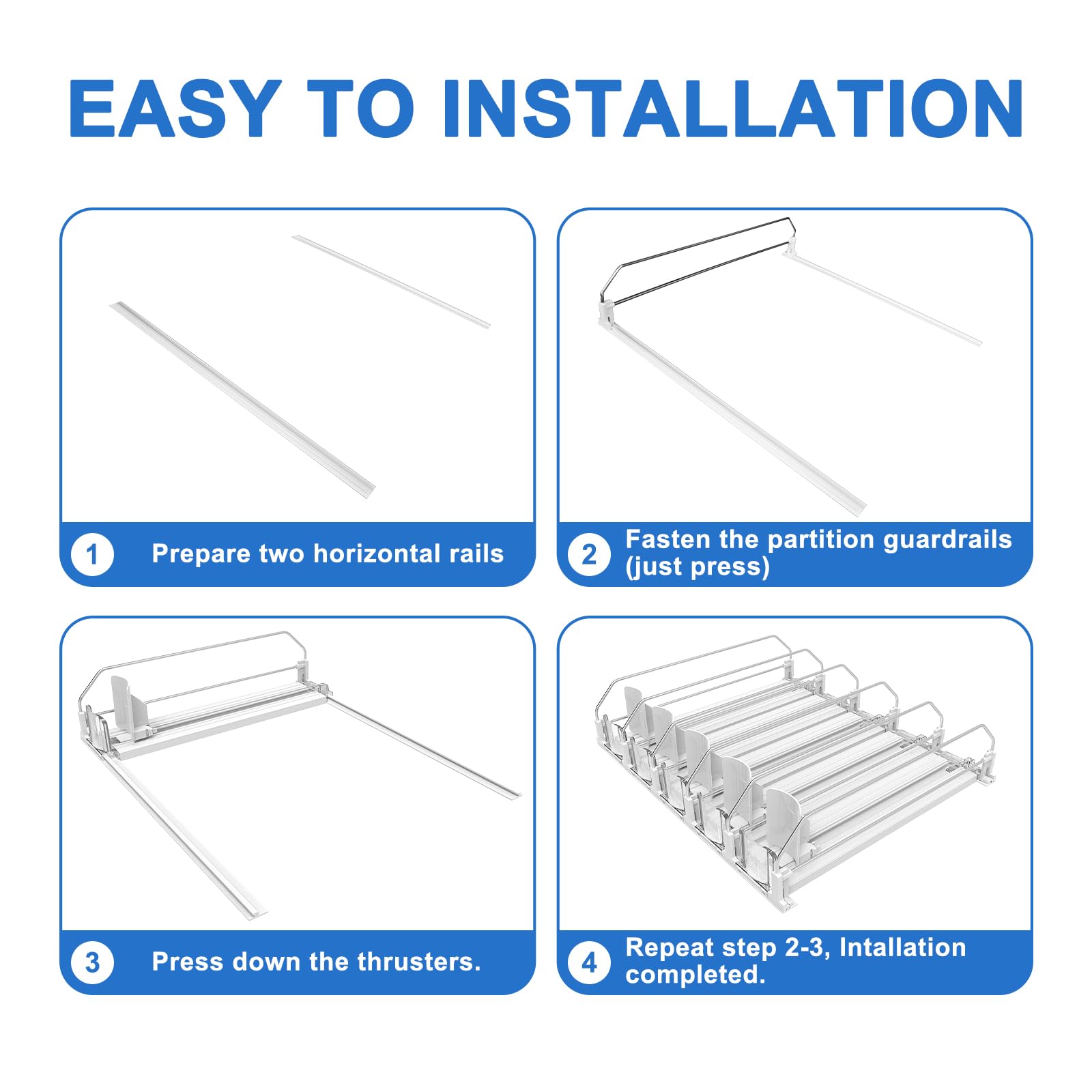 - 【Self-Propelled Soda Can Organizer】Self-propelled soda can organizer for refrigerator is an excellent organizing tool. The refrigerator storage tank consists of spring push rods, and galvanized iron partitions with a slide function. When you remove the first beverage from the refrigerator soda dispenser, the beverages behind will automatically push forward. Keep your drinks organized.