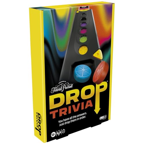 Details: In the Drop Trivia party game, players have all the answers—they just need to drop them in order! This fast-action, electronic trivia game plays in as little as 15 minutes. Play head-to-head with 2 players or in teams. In each round, start by dropping a trivia card with 6 answers into the game tower. Then each side takes turns trying to guess the correct order of the answers to score points. For example, rank 6 debut albums from least to most recent. Players place their guesses by dropping pucks into the tower, and they earn points for answers in the right spots. For a game show-like experience, the tower guides players through the game with voice commands and sound effects. After 4 rounds, the team with the most points wins! Looking for fun games for game nights or board games for adults? This game is a crowd-pleasing choice, and it’s a great gift for teens and adults who love trivia board games. Drop Trivia, Trivial Pursuit, and Hasbro and all related terms are trademarks of Hasbro.