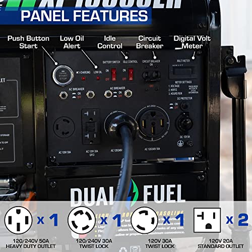 Details: Introducing DuroMax’s premier XP13000EH, 13,000-watt Dual Fuel portable generator. This unit provides the power normally found in stationary home standby units but in a portable package. The XP13000EH is a Dual Fuel workhorse powered by a 500cc, OHV Engine. With 10,500 watts of running power and the ability to surge up to 13,000 watts, this generator can power household essentials such as lights, large appliances, and central A/C systems. Features 13,000 starting watts and 10,500 running watts for the most demanding needs Dual Fuel technology allows generator to be run on propane or gasoline Powered by a DuroMax 500cc OHV Engine Fully featured power panel includes a push button start and a wide selection of outlets for maximum compatibility in your applications including: 2 120 V household GFCI outlets, 1 120 V 30 A twist lock outlet, 1 240 V 30 A outlet, and 1 240 V 50 A outlet EPA and CARB approved for use in all 50 states. Please read the detailed safety instructions in the manual before operating.