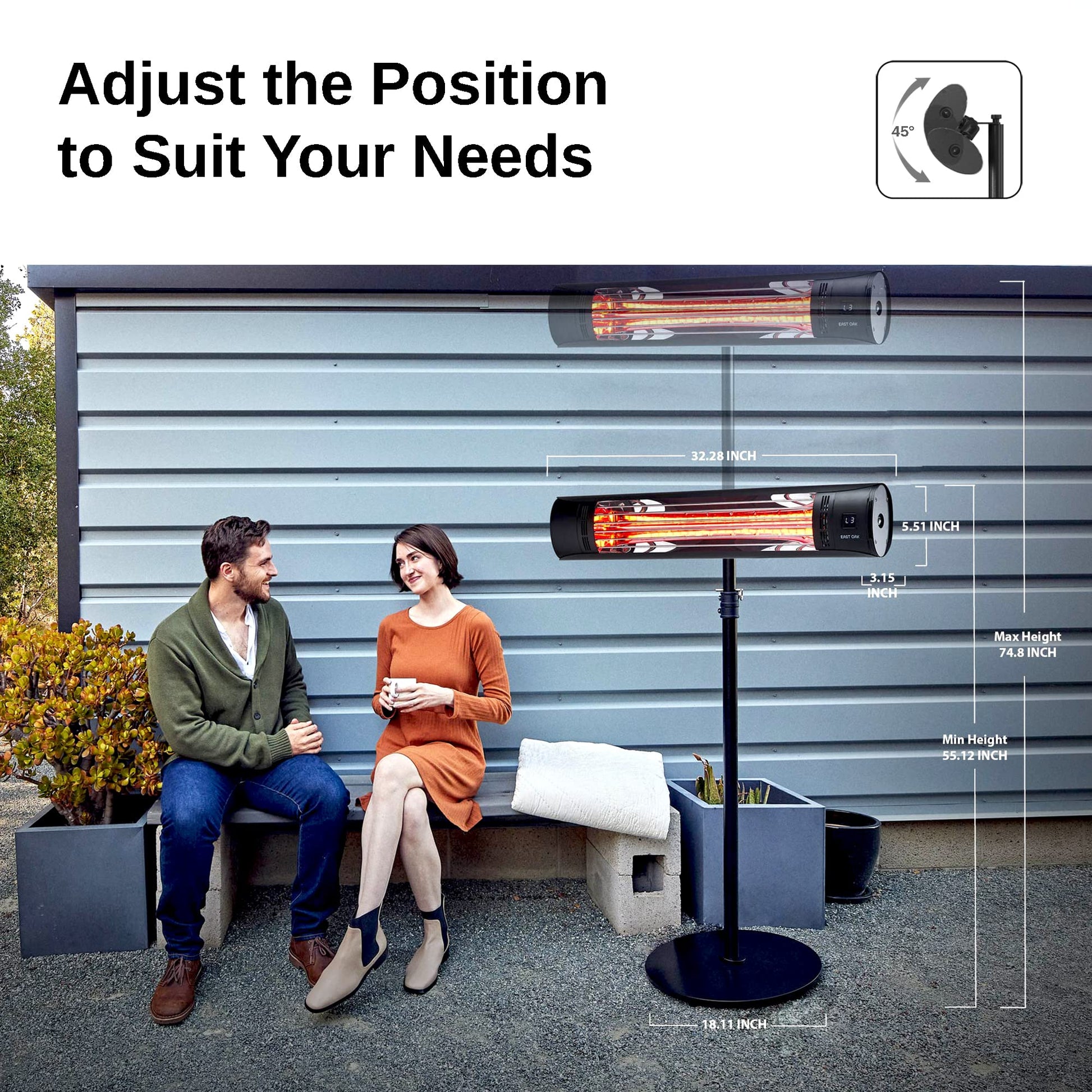 - 1-SECOND WARMTH AT STARTUP: WITH patented ULG gold-coated heating lamp and infrared electric fast heating technology, the EAST OAK Electric Patio Heater provides instant heat within 1 second of switching on. Up to 100 percent of the energy is transferred directly as heat to nearby people and surfaces.Heating Coverage:64.58-96.86 sq. ft.