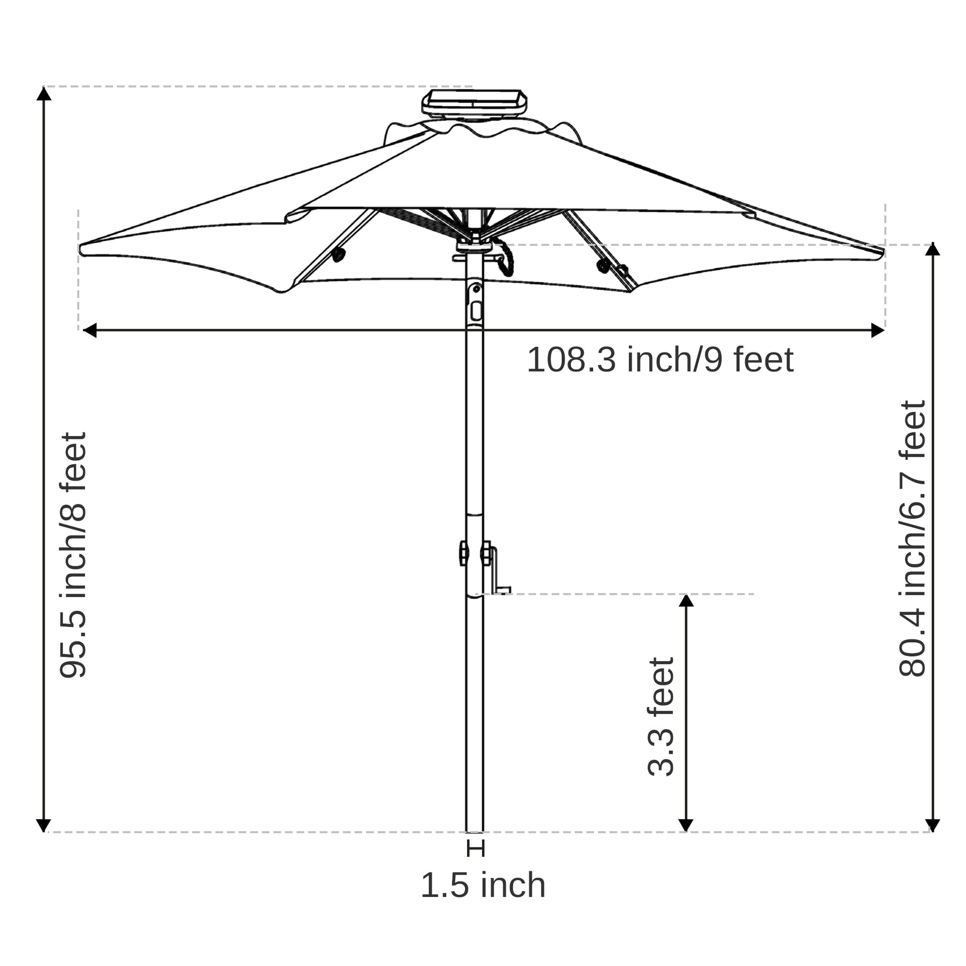 Details: Product Description Why choose EAST OAK 9ft patio umbrella? 1.The material is strong and not easy to break. The umbrella is supported by eight iron umbrella bones, the thickness of each bone is 0.5mm.The umbrella is a 1.5-inch diameter, 0.6mm thick iron pipe, and all add a rust-free coating, strong wind resistance is not easy to break at the same time can also prevent rust. 2. The canopy is sun and water resistant also not easy to fade, can be used for a longer time. The canopy is made of high-quality polyester fabric, color fastness to American Standard 4, long-term use in the sun does not fade. At the same time the umbrella surface has a waterproof wear-resistant effect, whether rain or shine, the umbrella can be stored outdoors, but also have a longer Uv30 + sunscreen rating can also reduce the UV rays to bring you harm, enjoy the outdoor scenery. 3.More lights bring stronger lighting effect. We have installed a center light in the center of the umbrella, while each umbrella bone is installed with 5 LED lights, a total of 41 lights in the umbrella distribution, more LED lights will make the umbrella more bright. Through the solar electric panel outside the umbrella to absorb energy during the day, these lights can run a total of 6-7 hours. 4. Simple operation, a full range of shade. Complete installation instructions and has been installed in the center of the light, for you to reduce the installation difficulties. Aluminum crank handle and push-button tilt system allows you to open the umbrella in a few seconds and adjust the angle of the umbrella according to the direction of the sun. If you need to put the umbrella away, we also have a Velcro strap sewn onto the umbrella to help you store it. Manufacturer Contact Information 1-833-EAST-OAK (USA) 1-833-327-8625 Mon-Fri: 9:00 am - 5:00 pm PST/PDT