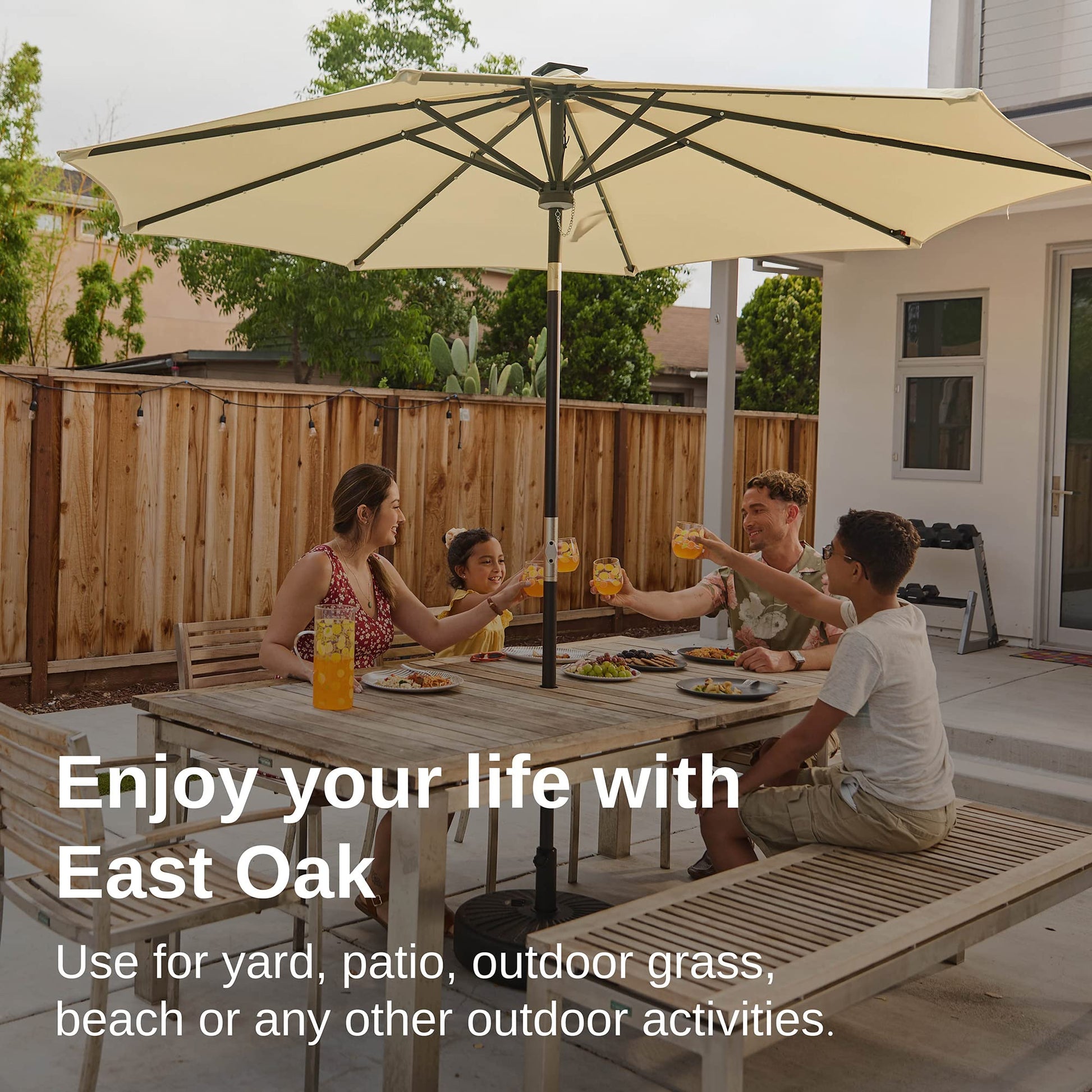 - SOLAR-POWERED LED LIGHTS: East Oak patio umbrellas feature 40 LED lights, and a pre-installed center light to liven up your nights. The clean energy from the attached solar electric panels allows the lights to last 6-7 hours, ideal for nighttime gatherings and relaxed evenings. Flip the switches, bring your friends, and enjoy life.