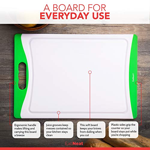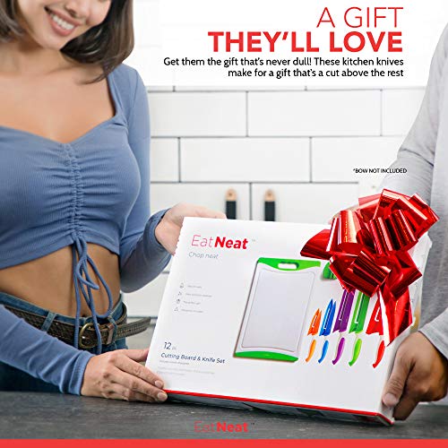 Details: These intelligently designed Eatneat knives will enhance the cooking and kitchen of most any level of chef, while their beautifully vibrant design and sharp colors will brighten your kitchen as well as your meal. In addittion, we keep your health and safety as our foremost concern. All products in this set are made from BPA free environment friendly food-grade materials. Each of the 5 sharp knives come with it's perfectly fitted protective sheath that will protect you and your children from any harm while the knives are stowed away in kitchen drawers. The neon green knife sharpener will keep your knives from going dull and you'll never worry about buying another knife again. In just 3 seconds your knives will be as sharp as ever! The cutting board encompasses all the bells and whistles at only a fraction of the price of our expensive competitors. Some key features of the cutting board include non-slip feet, juice grooves to retain juices/prevent a mess, and a convenient carrying handle. The perfect assortment of knives will have you prepared for all types of slicing, dicing, mincing and chopping. Once you're finished using the set, simply put any and all of the items in the dishwasher since the entire set is dishwasher safe! Or, easily handwash and stow back in the drawer. WARNING: SHARP EDGES
