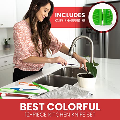 - Complete Chef's Collection: The EatNeat 12-Piece Knife Set features five stainless steel knives in vibrant colors, each with its own safety sheath, blending functionality with style, perfect for kitchen use and outdoor camping.