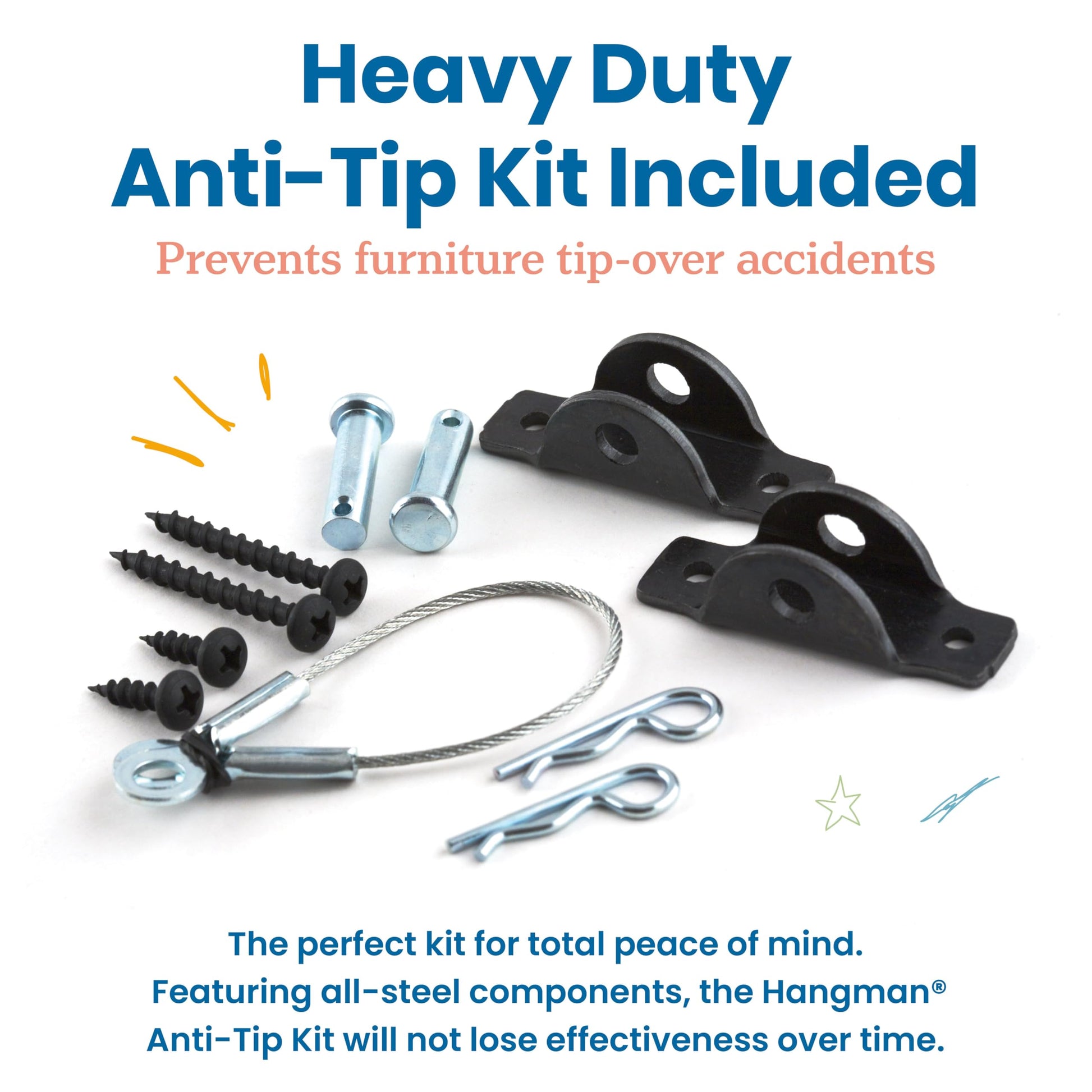 - Anti-Tip: Contains a heavy-duty HANGMAN Furniture Anti-Tip Kit featuring all-steel components; when properly installed using the attached instructions, prevents furniture tip-over