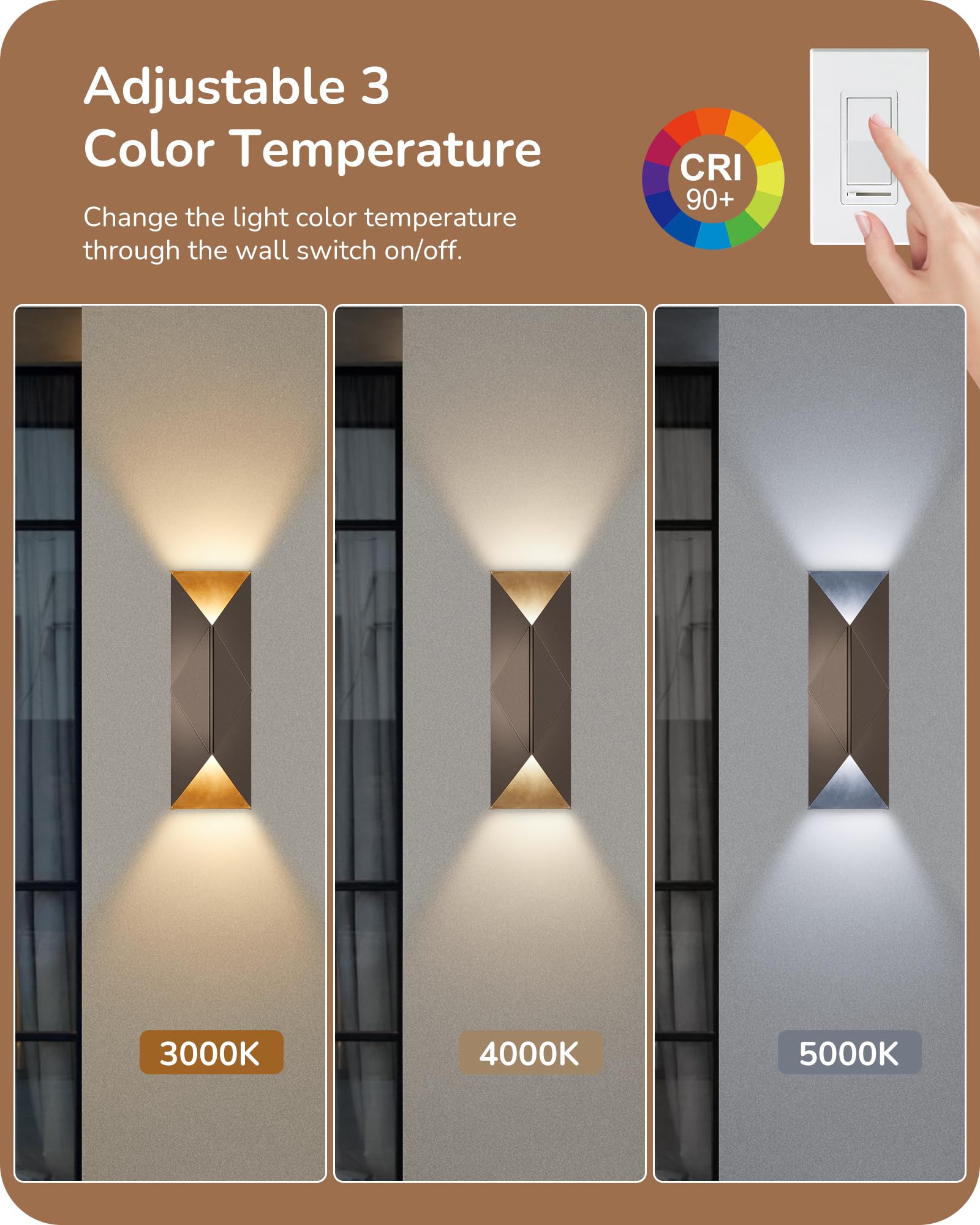 - [3 Color Temperatures] 3-color temperatures to suit your preference, 3000K warm light, 4000K neutral light, and 5000K cool light, from cozy to vibrant settings; use the wall switch (switch not included) to adjust the dimmable up and down wall lamp, turn on and off within 10s can change the color temperature, the on-off interval time>10s, keep the color temperature and brightness before closing