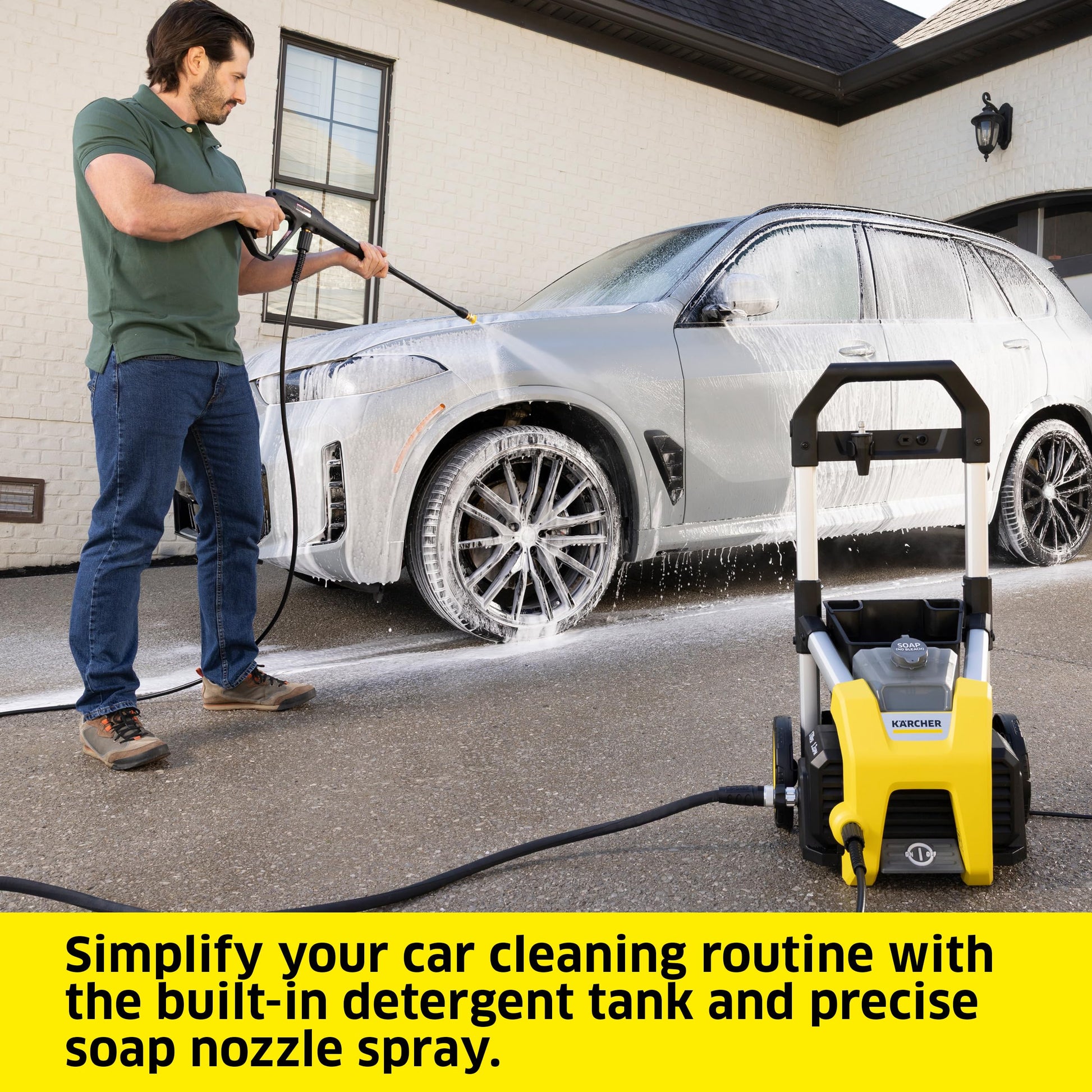 Details: The Kärcher K1700 is a versatile electric pressure washer ideal for all-around cleaning. With a 2125 max. PSI output and a maximum GPM of 1.46, this power washer is easy to use for any homeowner and offers convenient features for efficient cleaning. The kit includes three different spray nozzles with a universal quick-connect fitting: a 15° nozzle for regular cleaning tasks, a turbo nozzle for intense cleaning power, and a 65° soap nozzle for applying detergent and achieving a sparkling finish. The integrated detergent tank on the top of the unit makes it easy to apply your favorite pressure washer detergents. For added convenience, the detergent tank is removable to fill and clean when needed. Thanks to the three different nozzles, the K1700 can be used to clean cars, patios, fencing, decks, and much more. The integrated storage container on the back of the unit keeps the trigger gun, hose, and spray wand securely stored away while not in use, ensuring everything stays organized. The nozzles can be secured on the handle when not in use, so you never misplace one ever again. Keep the power cord neatly organized using the cord wrap on the handle, where you can also store the power plug. The portable power washer features never-flat tires, so you can transport and use the unit anywhere on your property. No tools are needed for the assembly of the K1700, so you can start cleaning as soon as it arrives. The on/off foot switch provides easy power control, allowing you to turn the pressure washer on and off with a simple tap of your foot. Water flow is controlled separately through the trigger gun. This set includes the K1700, a pressure washer gun, a spray wand, a 15° nozzle, a 65° nozzle, a turbo nozzle, an adapter for 3/4" garden hose, a removable detergent tank, and a M22 18 ft. pressure washer hose.
