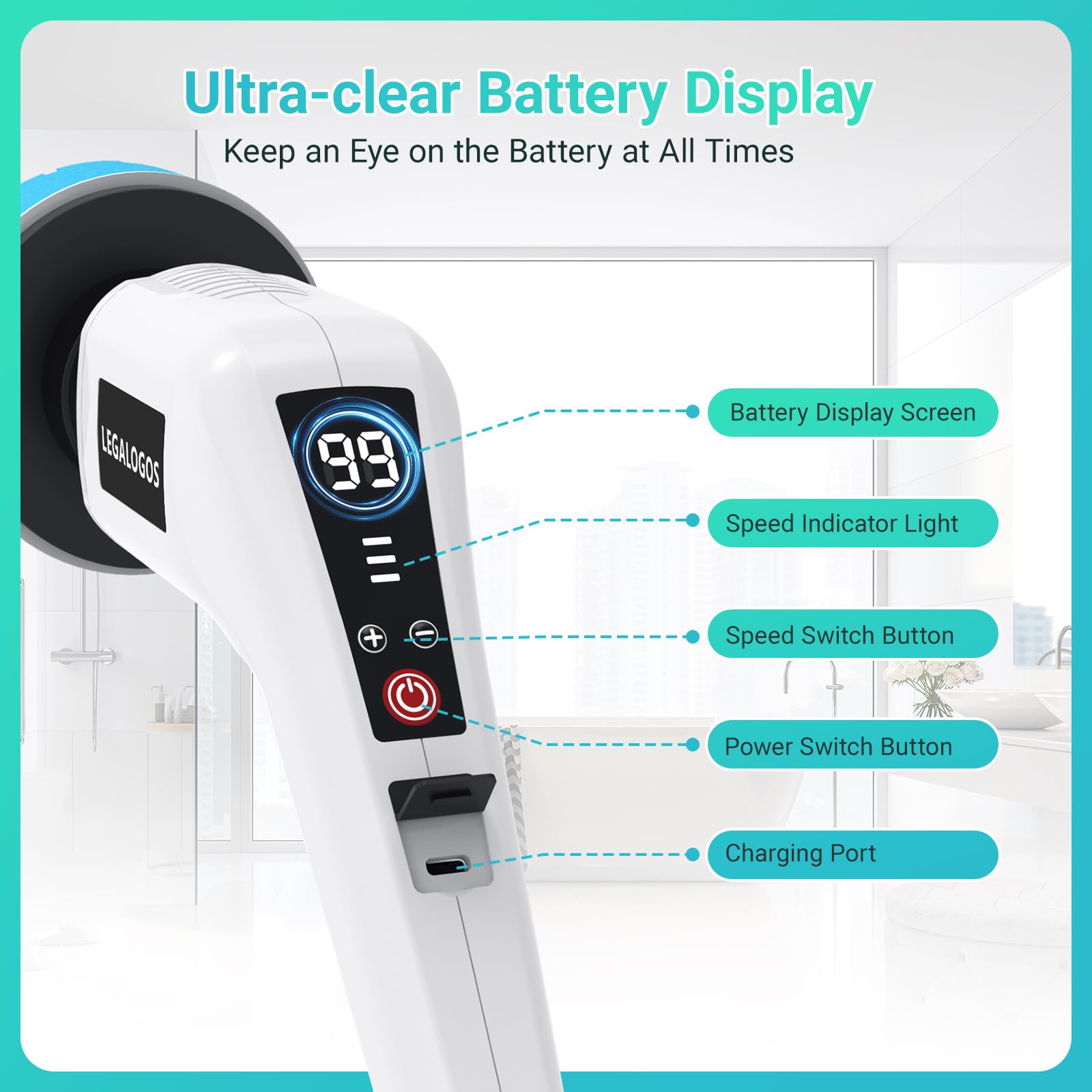 - 【2024 New Upgraded Battery Display】: Legalogos 2024 new electric spin scrubber with LED battery display. You can see its real-time remaining power, so you no longer need to worry about it being low on power. Let you know its power level at any time and plan charging time.