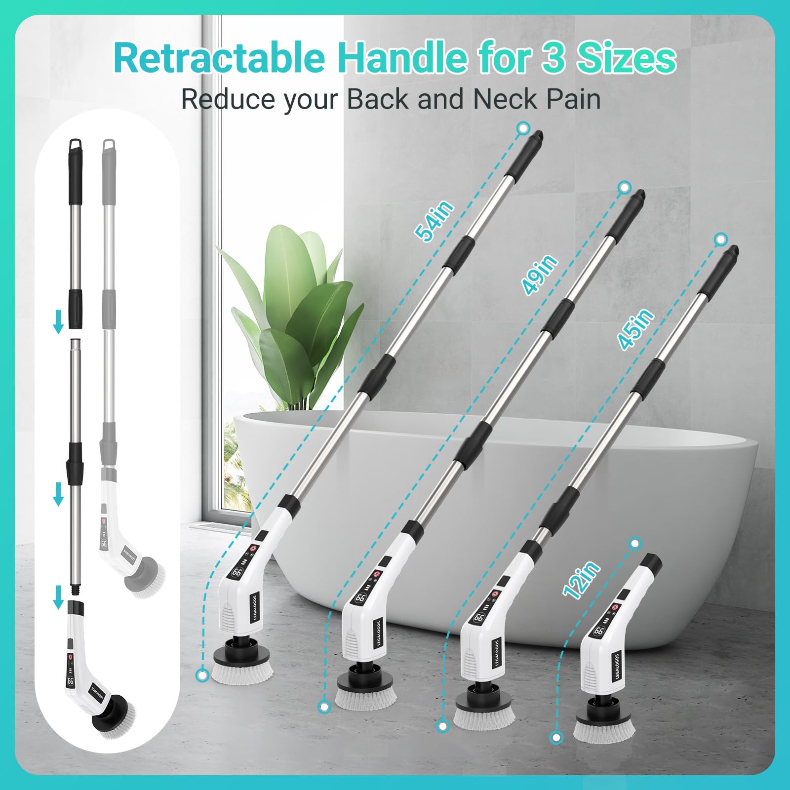 - 【Three Adjustable Sizes】: For those with back pain or weak knees, bending over to clean can be an ordeal. This electric spin scrubber has 3 adjustable sizes-54IN, 49IN and 45IN. The handle can also be detached and used separately. Baseboards with deep grout, corners of door frame tiles, etc. can all be cleaned efficiently. Each brush reaches deep into corners to effectively remove grout and stains.