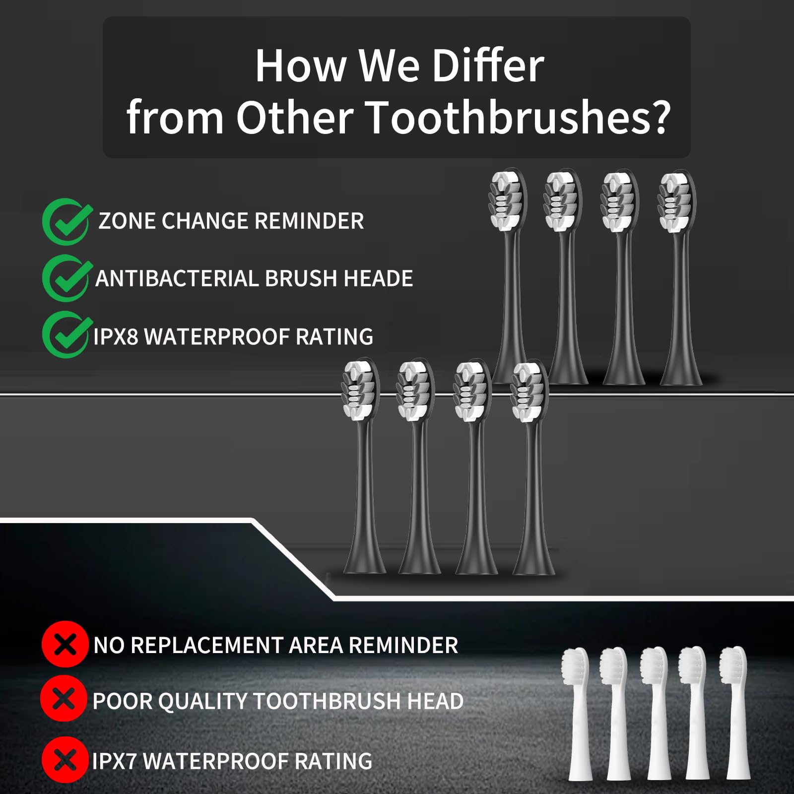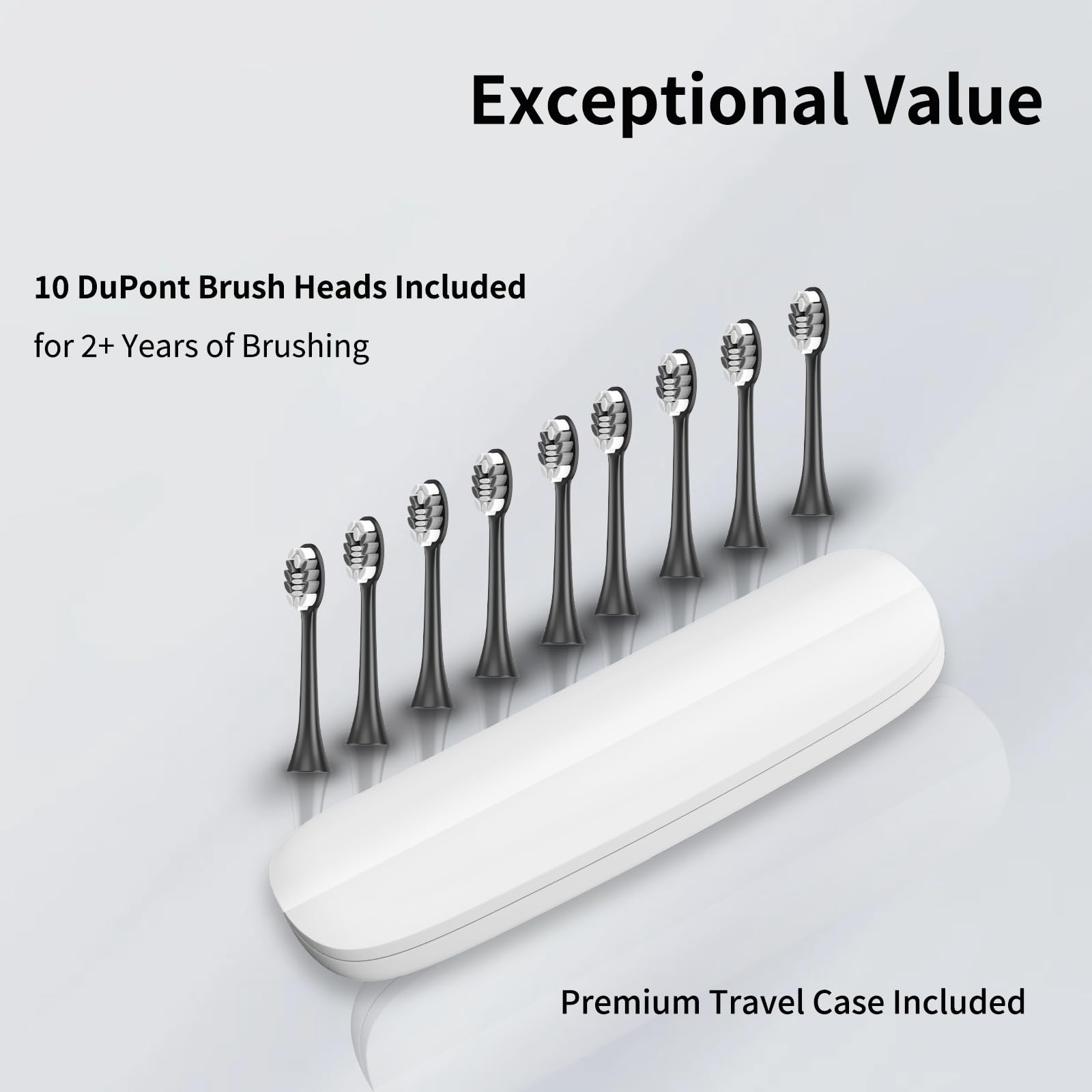 - 【Exceptional Longevity and Convenience】Providing 30 months of usage with 10 replacement brush heads (each lasting 3 months), this comprehensive accessory set also includes 1 travel case, 1 USB charging cable, 1 user manual, and 5 toothbrush stand. This ensures exceptional long-term value and convenience, keeping users well-equipped for extended use without the need to frequently purchase new brush heads.