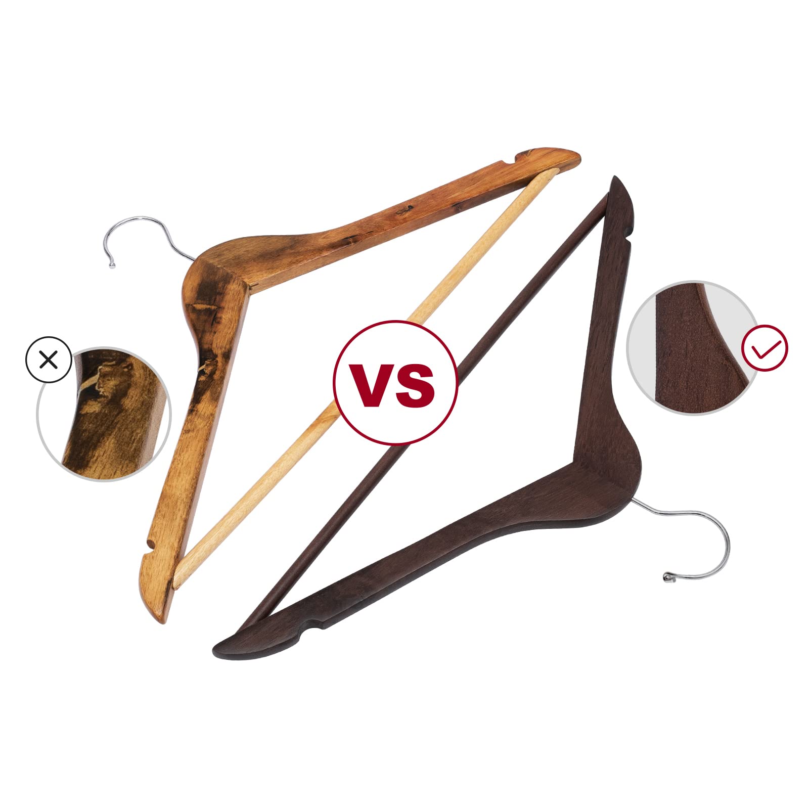 - SMOOTH POLISH SURFACE: Use eco-friendly glossy lacquering, snag-free to protect your valued garments. Double hand-sanding smooth wood suit hangers notches protect your delicate clothes from snagging.