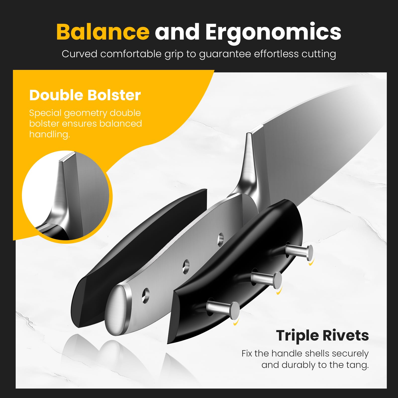 - Close to Fingers - Curved and plump handle make a full fit for your palm. And the necessary full-bolster design protect your fingers when cutting.