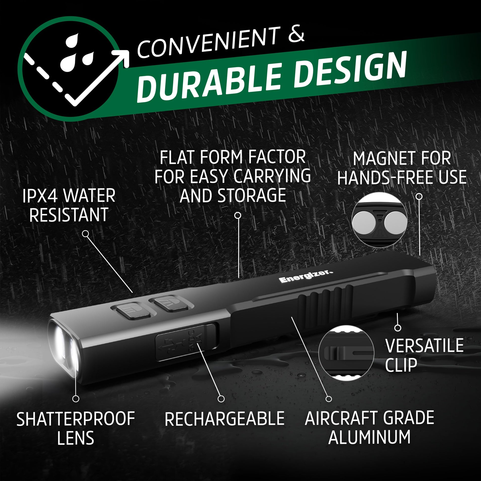 - PORTABLE FLASHLIGHT: One Energizer 1200SL-R Rechargeable LED Flat Flashlight, a slim flashlight that offers powerful brightness in a portable and unique form factor