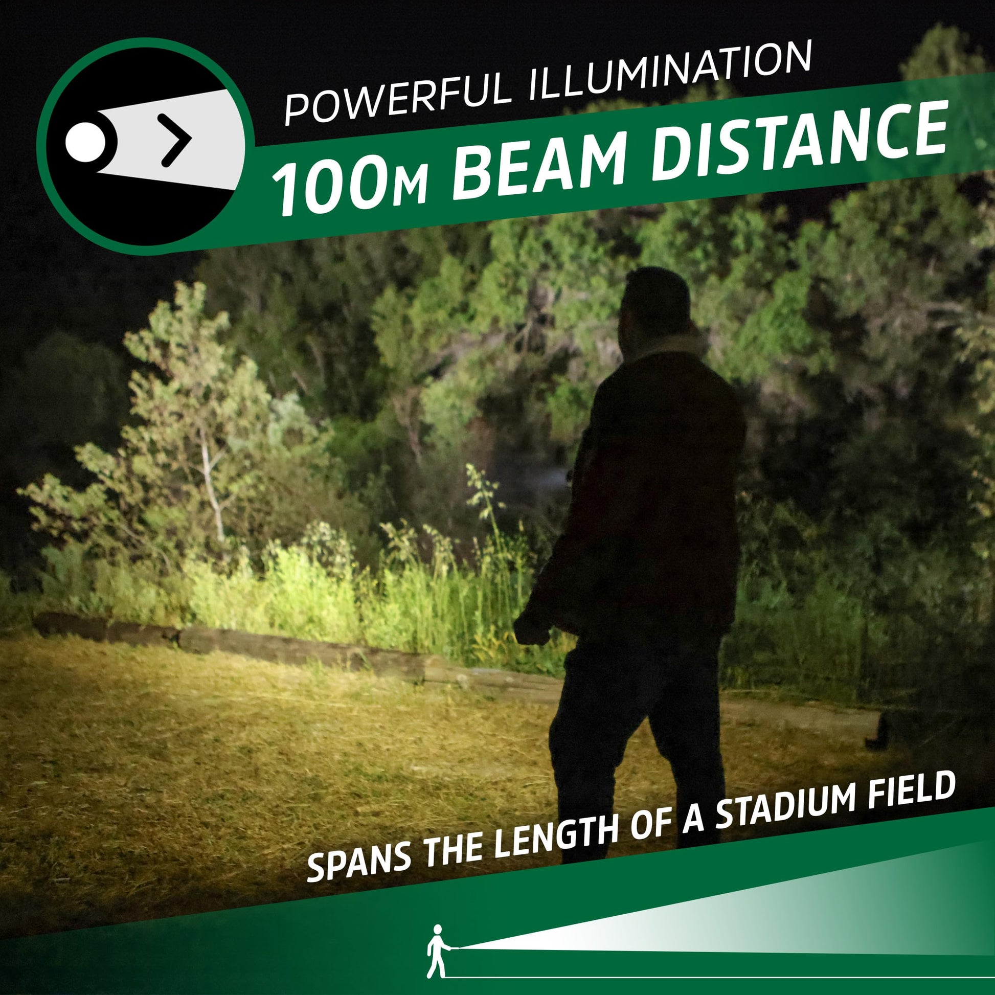 - UP TO 15X BRIGHTER THAN STANDARD LED TECHNOLOGY: emits up to 1,200 lumens of LED light on Boost mode, with a beam distance of up to 100m