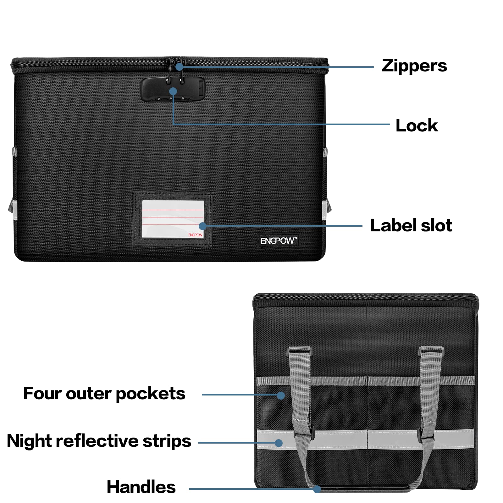 - Portable and secure: High quality combination lock design for added storage security, includes instruction manual for combination lock. Sturdy adjustable handle makes it easy to carry everything you need(You can adjust the carrying handle to the length you want), two zippers make it easier to open and close the box, Side pockets and label slots let you store small items and labels.The file lock box collapses down simply for easier storage when not in use.