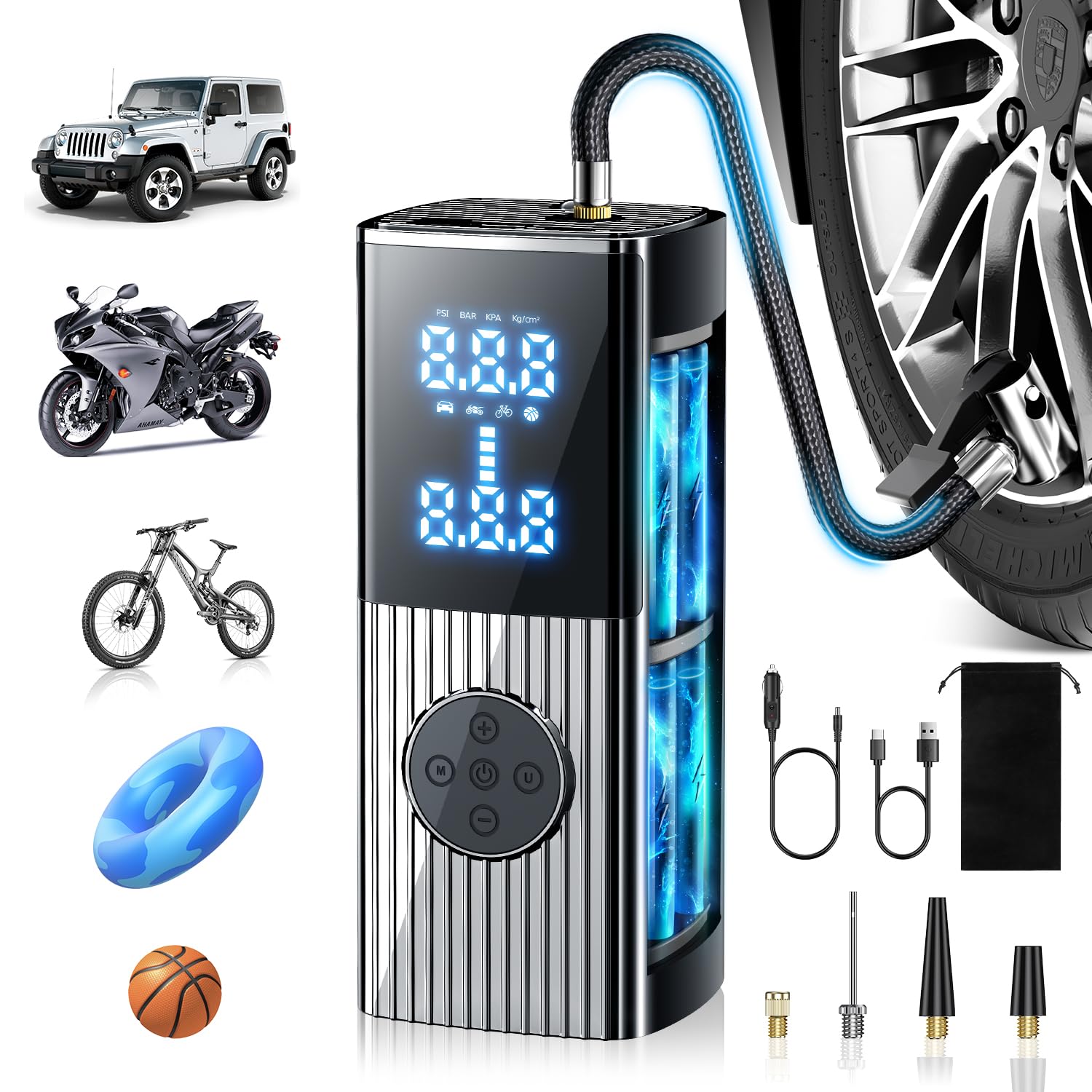 EnjoyNest Tire Inflator Portable Air Compressor, 20000mAh Portable Air Pump with Digital Pressure Gauge, LED Light, 38L/Min Fast Inflation for Cars, Bikes & Motorcycle Tires, Inflatables, Balls