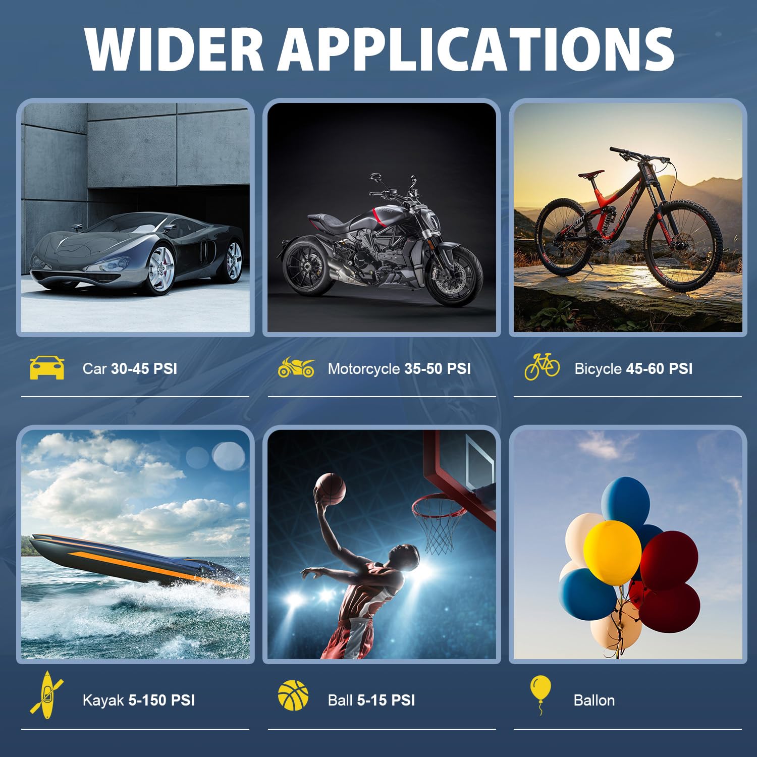 - 【4+N Smart Modes】: The air compressor has four types of pressure units: PSI, KPA, BAR, and KG/CM ². There are four preset inflation modes: bicycle, motorcycle, car, and ball. The fifth custom mode can also set pressure values based on the inflation object to meet various inflation needs. It is an essential product for daily life and travel.