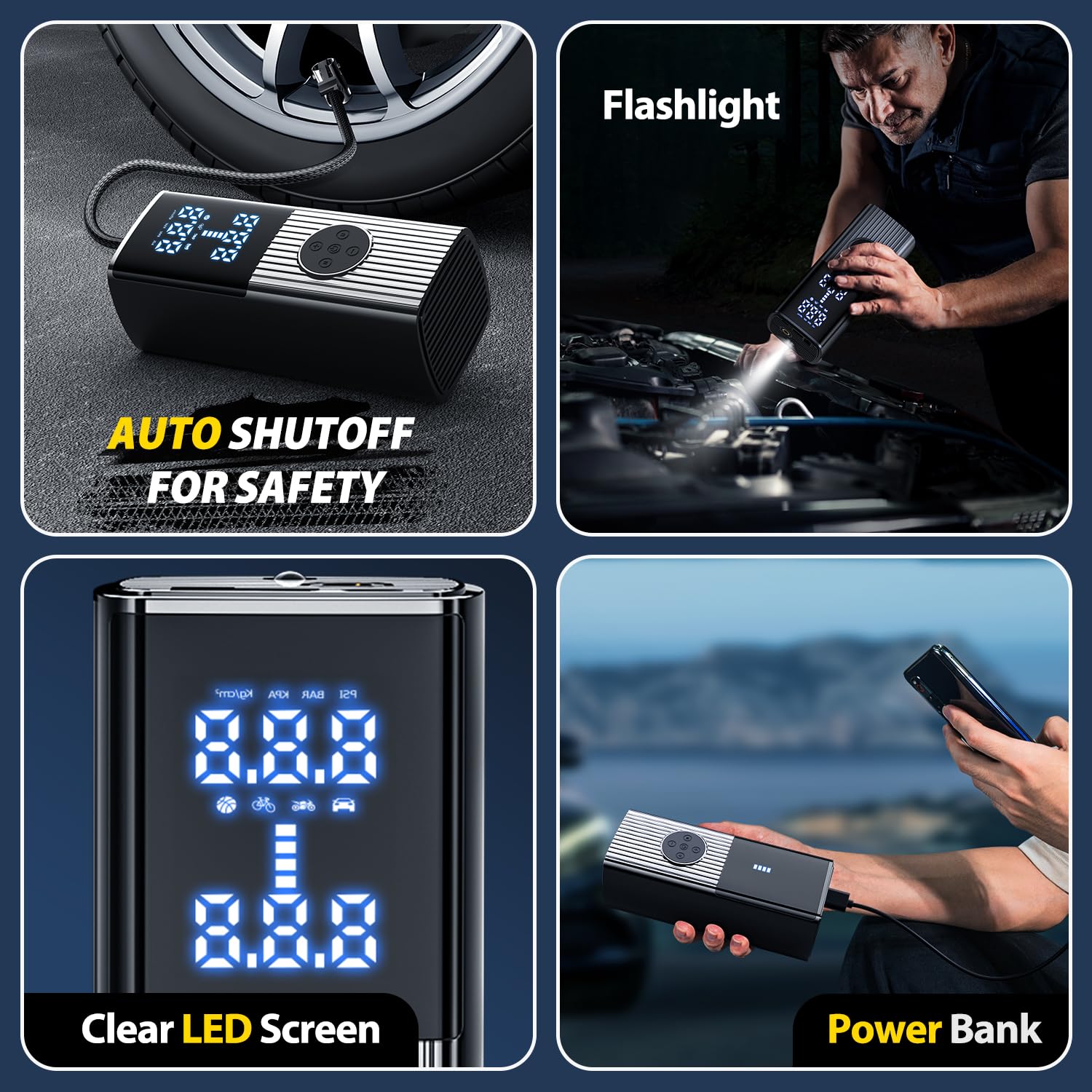 - 【5X Quick Inflation/Dual Screen Display】: With a powerful motor, this portable air compressorPortable Air Compressor provides airflow of 38L/Min, inflating Car Tires from 25PSI to 36PSI in just 1 minute (for 185/65 R15 Tire). It offers a max pressure of 180PSI, making it a reliable tool for emergencies on the road.The large-sized LED display screen displays real-time pressure values and preset values, making it easy to monitor tire pressure status