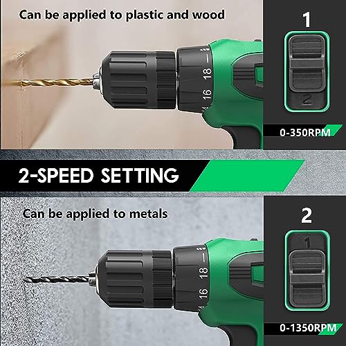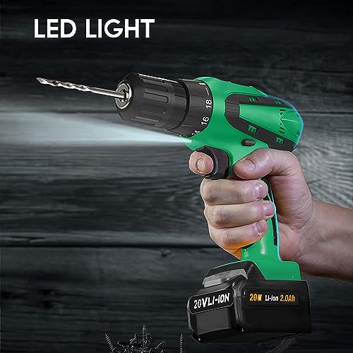 - 20 Voltage & 2 Variable Speeds:Higher voltage provides premium drill performance and means more torque-spinning strength to overcome resistance.Our drill driver set was equipped with 2 variable speeds (0-450RPM,0-1450RPM) which gives you the versatility for drilling different materials and using a variety of bits.