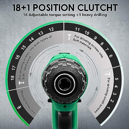 - 18+3 Clutch &310 In-lb Torque: Super power drill cordless provides 310 IN-LB of max torque. Our cordless drill with 18+3 Clutch provides precise control for drilling, which helps to prevent sinking a screw too deep, stripping out the head of a screw or even breaking a screw shaft.