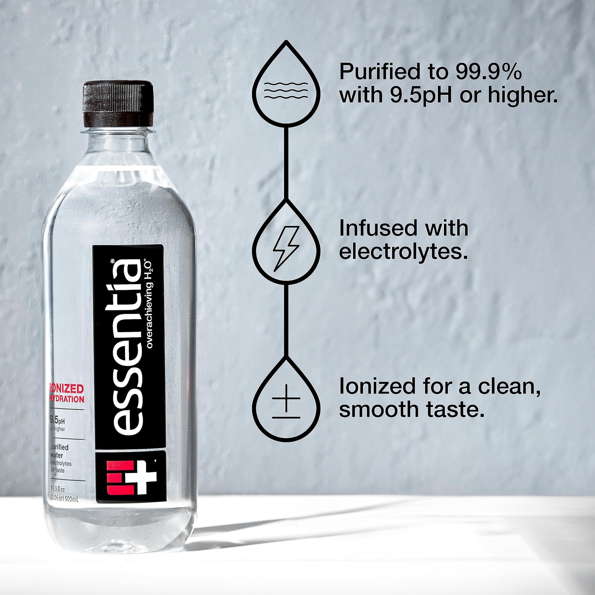 - 99.9% PURE: Essentia Water is purified with micro filtration and reverse osmosis technology, resulting in Overachieving H2O that is 99.9% pure.