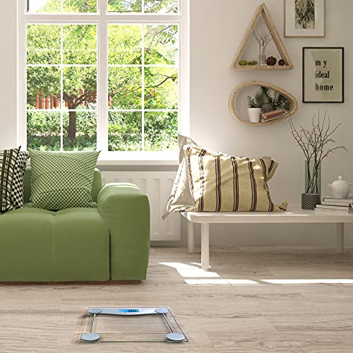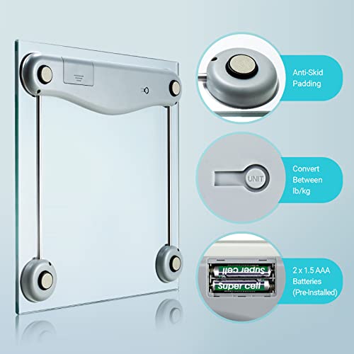 Details: RELIABLE READINGS in an instant—step on the large platform and receive accurate measurements in pounds or kilograms. Specifications: 1. Weigh up to 400lb / 180kg. 2. PRECISION BUILT with 4 high-precision sensors, delivering results with a 0.2lb / 3oz. 3. Accuracy resolution cleanly displayed on an easy-to-read LCD screen. 4. TEMPERED STRENGTH: Built with a thick and durable 6 mm clear tempered glass platform resilient enough to provide years of fitness tracking. Note: 1.Check the scale before using. Do not use the scale if it is damaged. 2.Do not strike or bang on the scale and do not use the scale if there is a slight crack on the glass. Due to the nature of tempered glass, the glass will shatter if there is a slight crack.