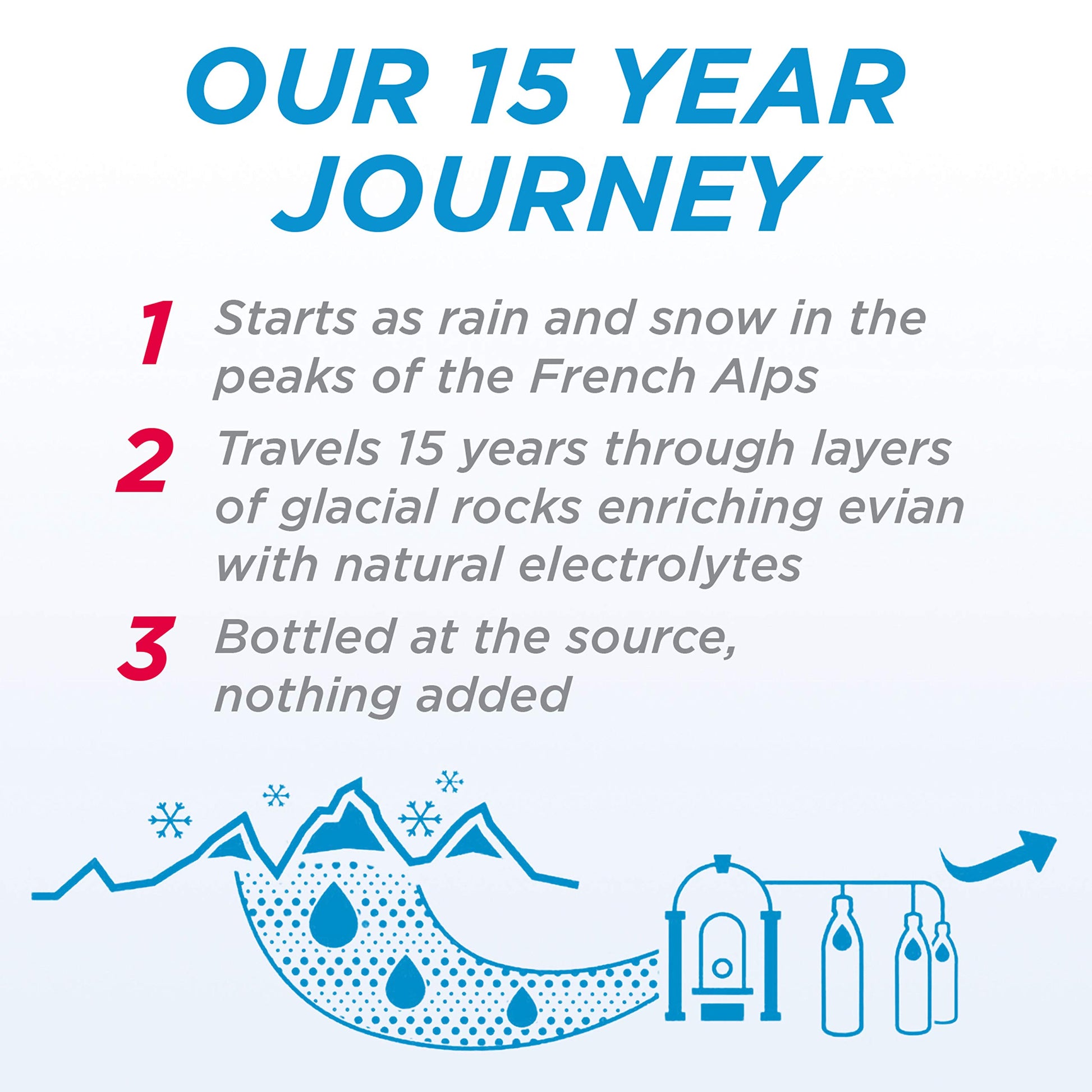 - CRAFTED BY NATURE: Evian natural spring water begins as snowflakes and mountain rain, naturally filtered through glacial rocks for over 15 years, giving evian its purity, mineral content and neutrally balanced 7.2 pH for delicious natural spring water.