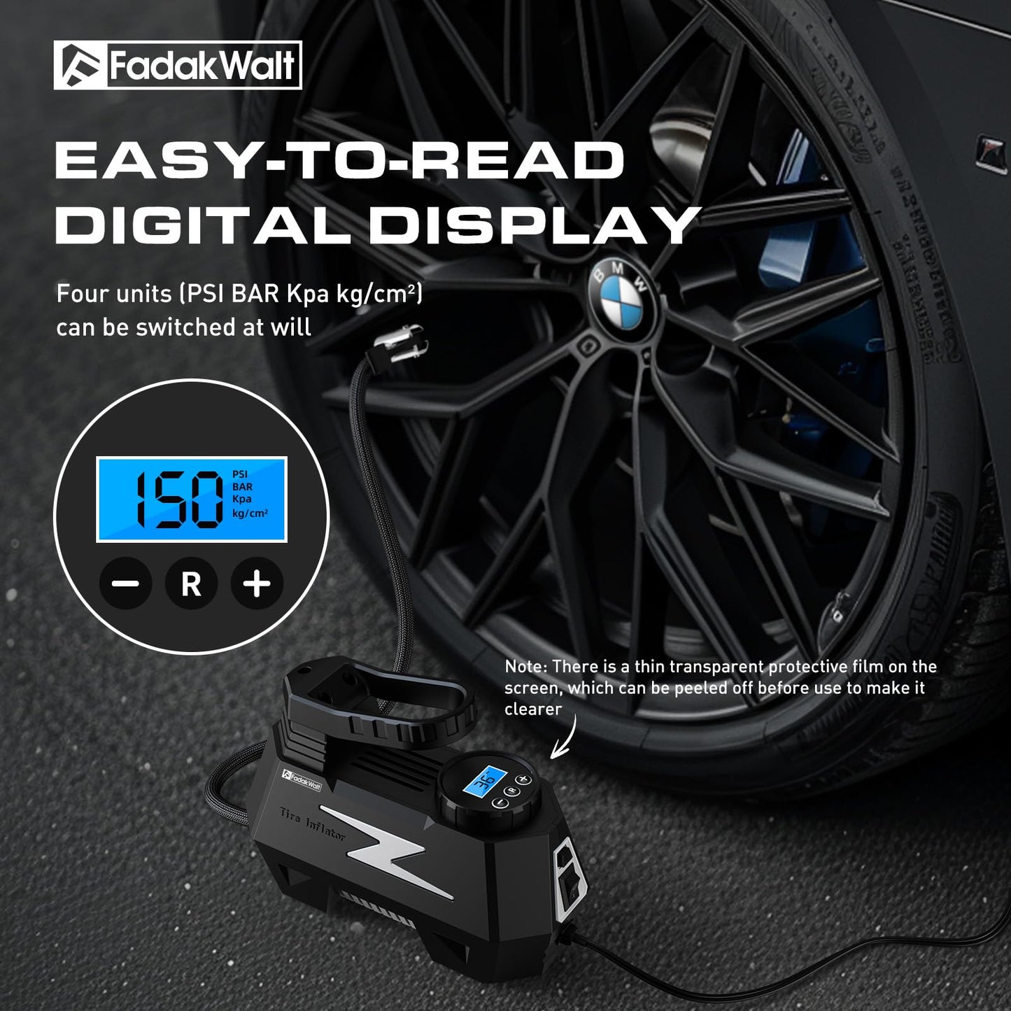 - Digital Display & LED Lighting: The FADAKWALT inflator features PSI, BAR, KPA, and KG/C㎡ modes, with an LED light for use in low light. The bright pressure gauge is readable even in the dark or strong sunlight