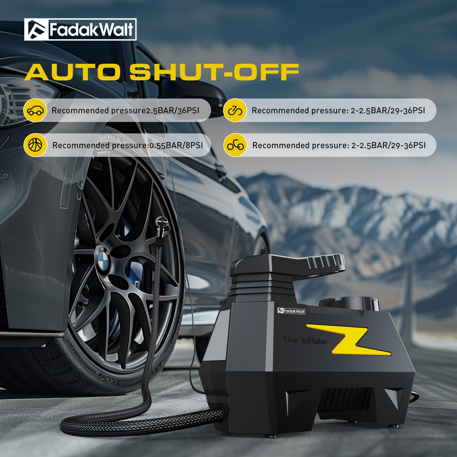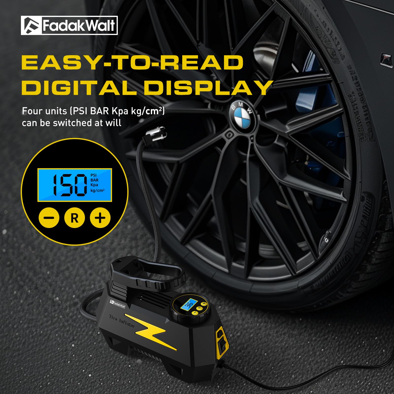 - Digital Display and LED Lighting: The FADAKWALT portable air compressor can switch four modes of PSI, BAR, KPA and KG/C㎡ in real time according to different usage scenarios. The equipped LED light can provide lighting in dim environments. The air compressor pressure gauge is bright enough for easy use even in the dark and can be seen under strong sunlight.
