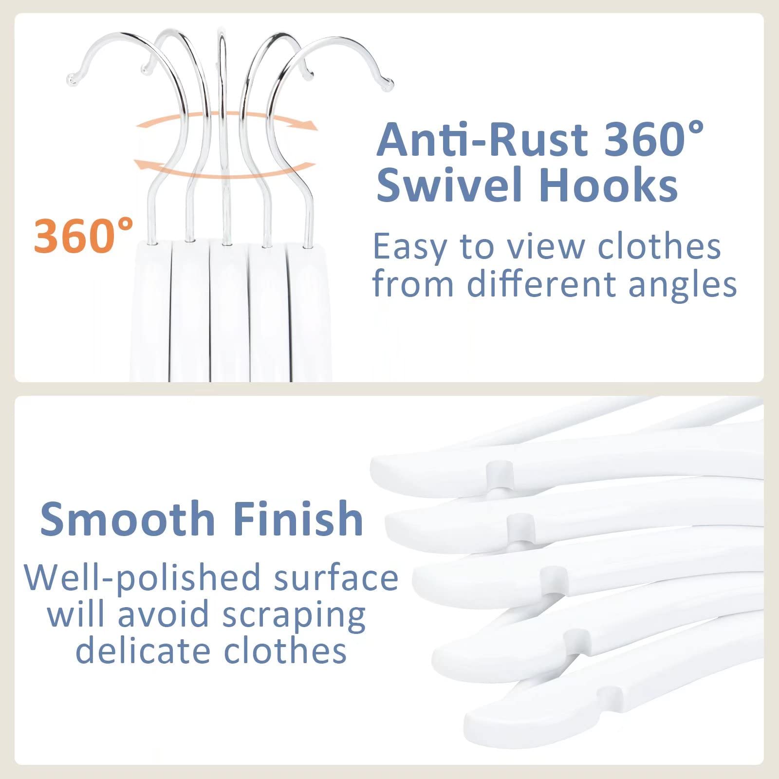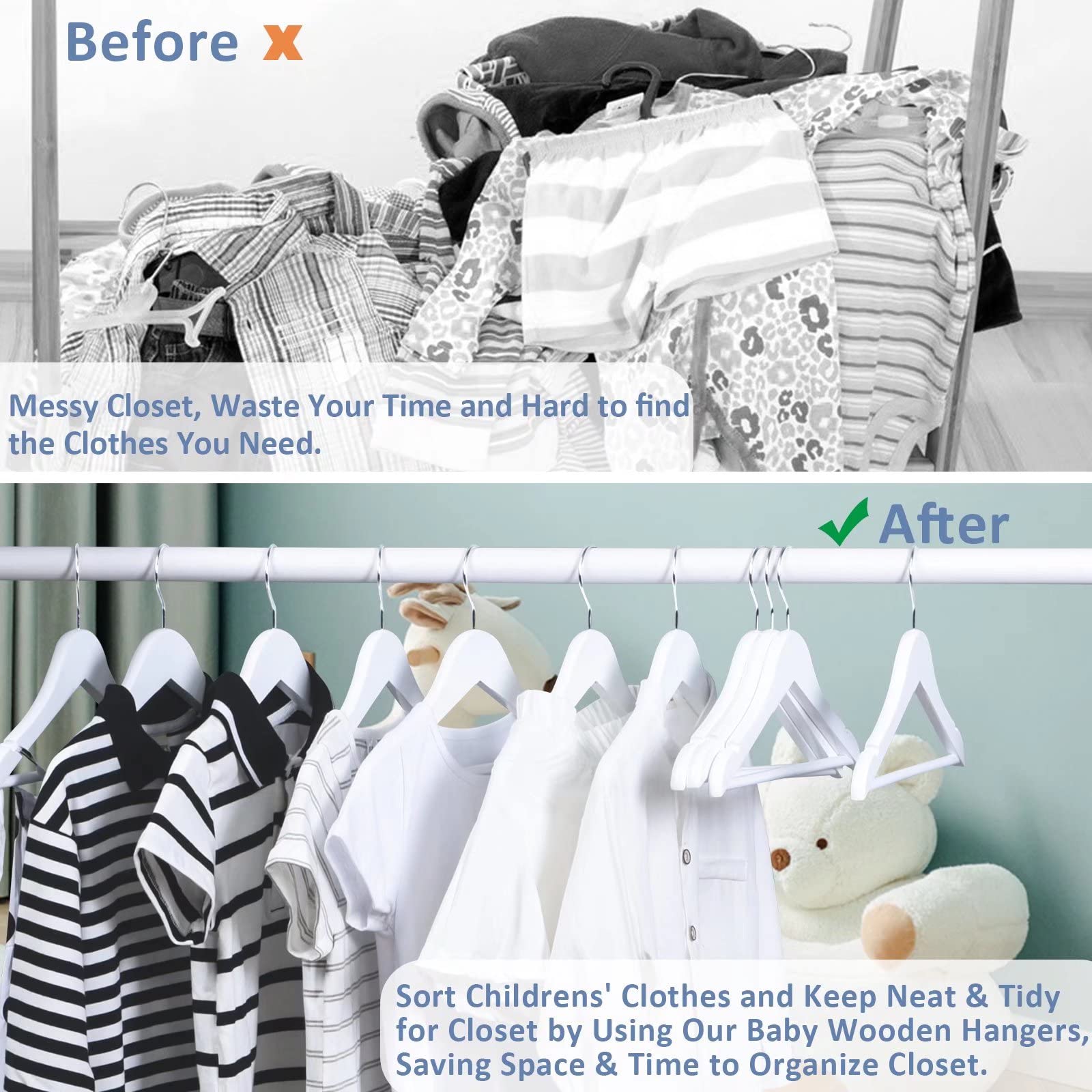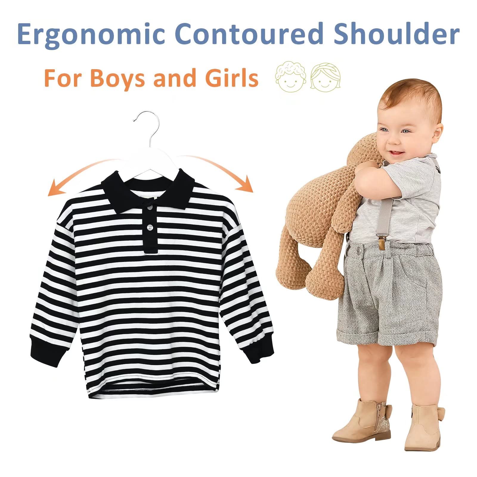 - Child-friendly Design & Smooth Surface: Well-polishing childrens hangers with smooth finish will protect little hands. No rough edge and burr on the white baby clothes hangers' surface to avoid scraping delicate clothes.