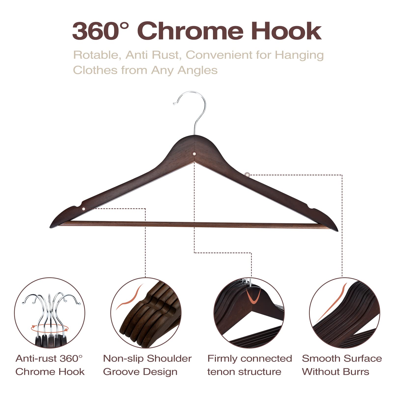 - Space Saving & Multi-purpose: Slim & light wooden hangers for closet with 360° rotating chrome hook, convenient for clothes storage and provide maximum storage for closet. Wooden suit hangers with strong pant bar, ideal for shirt, jacket, trouser, dress etc.
