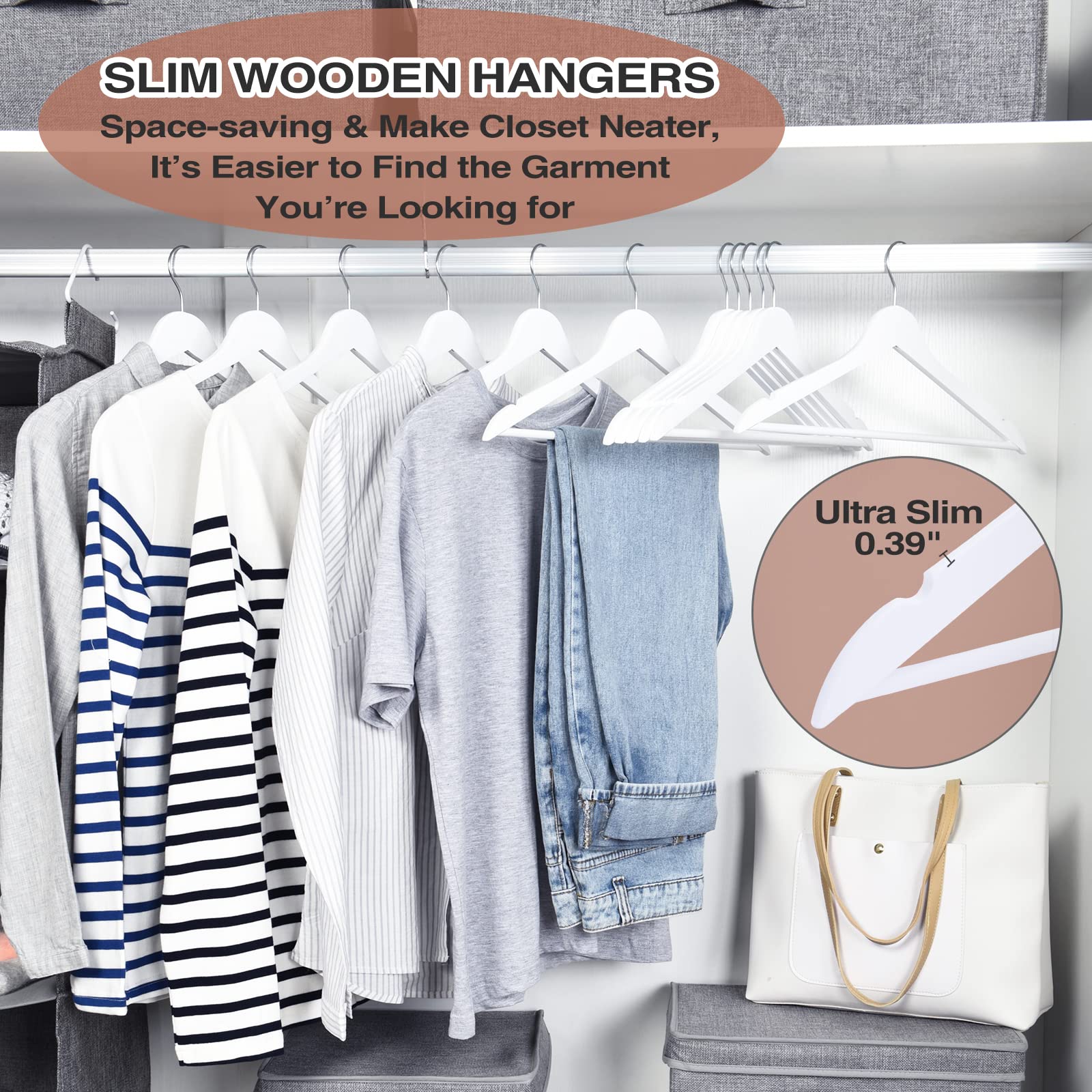 - Space Saving & Multi-purpose: Slim wooden hangers size: 17"x0.39"x8.5", lightweight yet durable, convenient for clothes storage and provide maximum storage for closet. Wood clothes hangers with strong pant bar, ideal for shirt, jacket, trouser, dress etc.