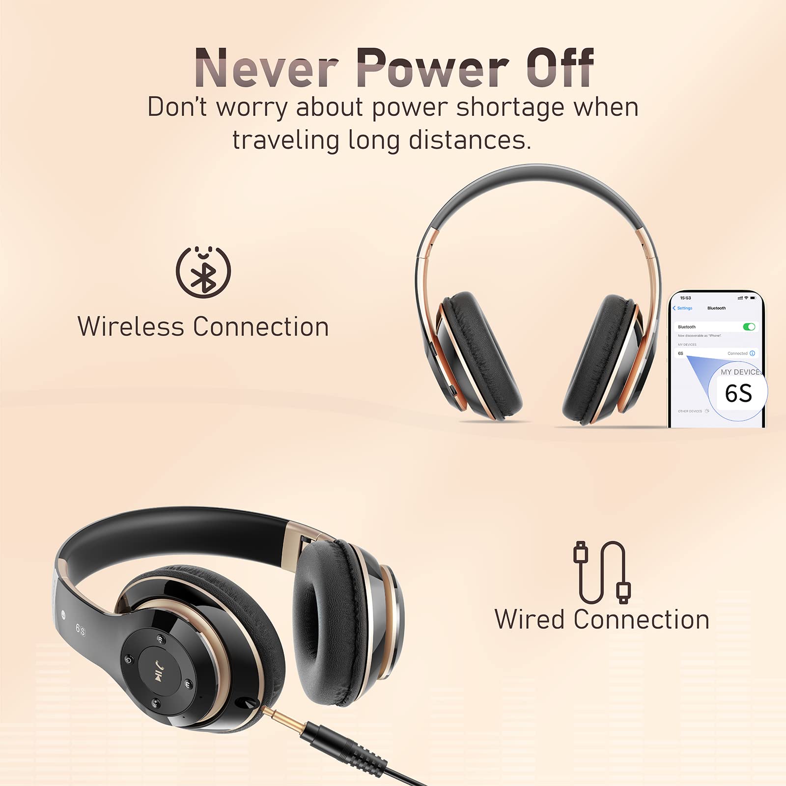 Falebare Bluetooth Headphones Over Ear, 6S Wireless Headphones Wired with 6 EQ Modes, 40 Hours Playtime Foldable HiFi Stereo Headset with Microphone, FM/TF for Cellphone/PC/Work (Black & Gold)