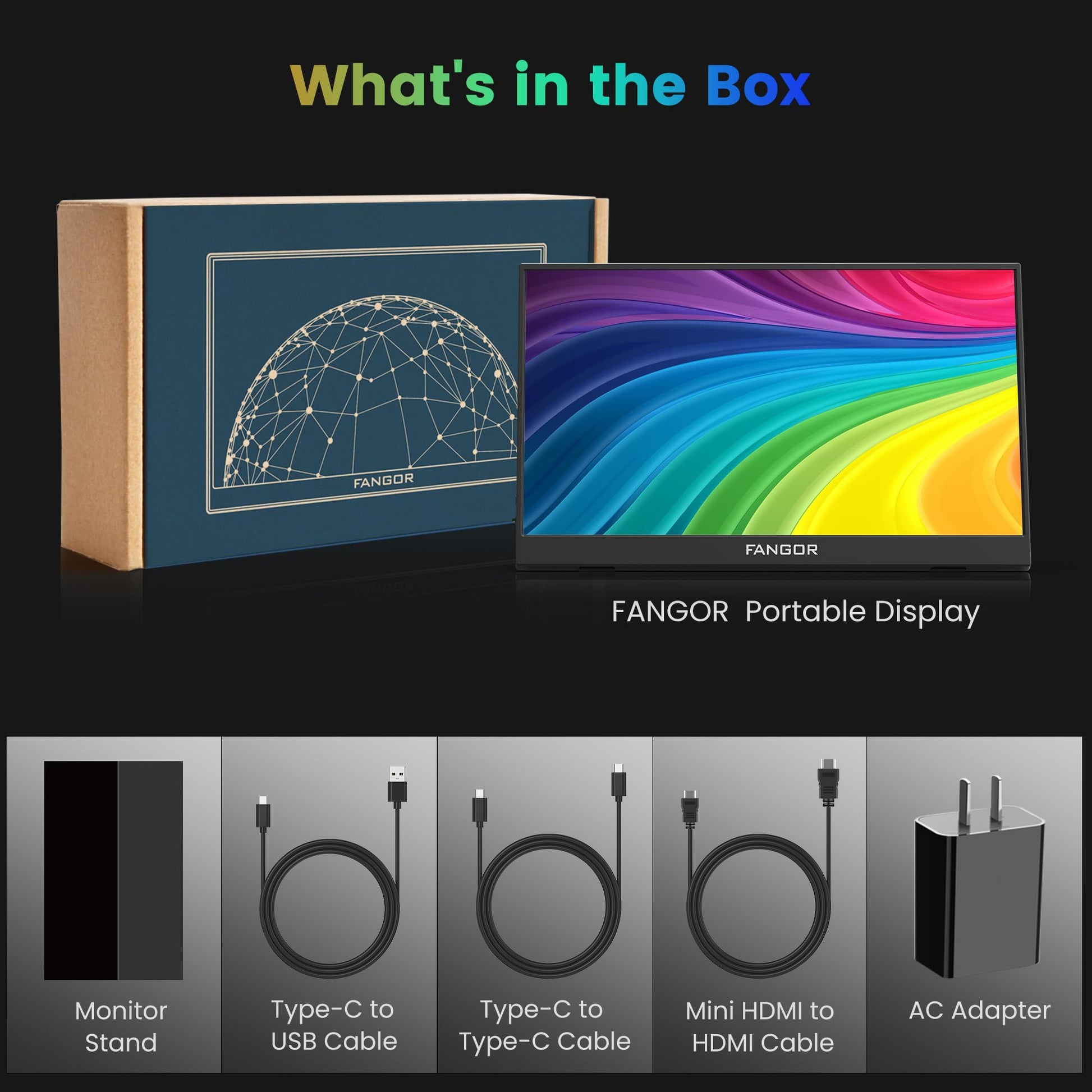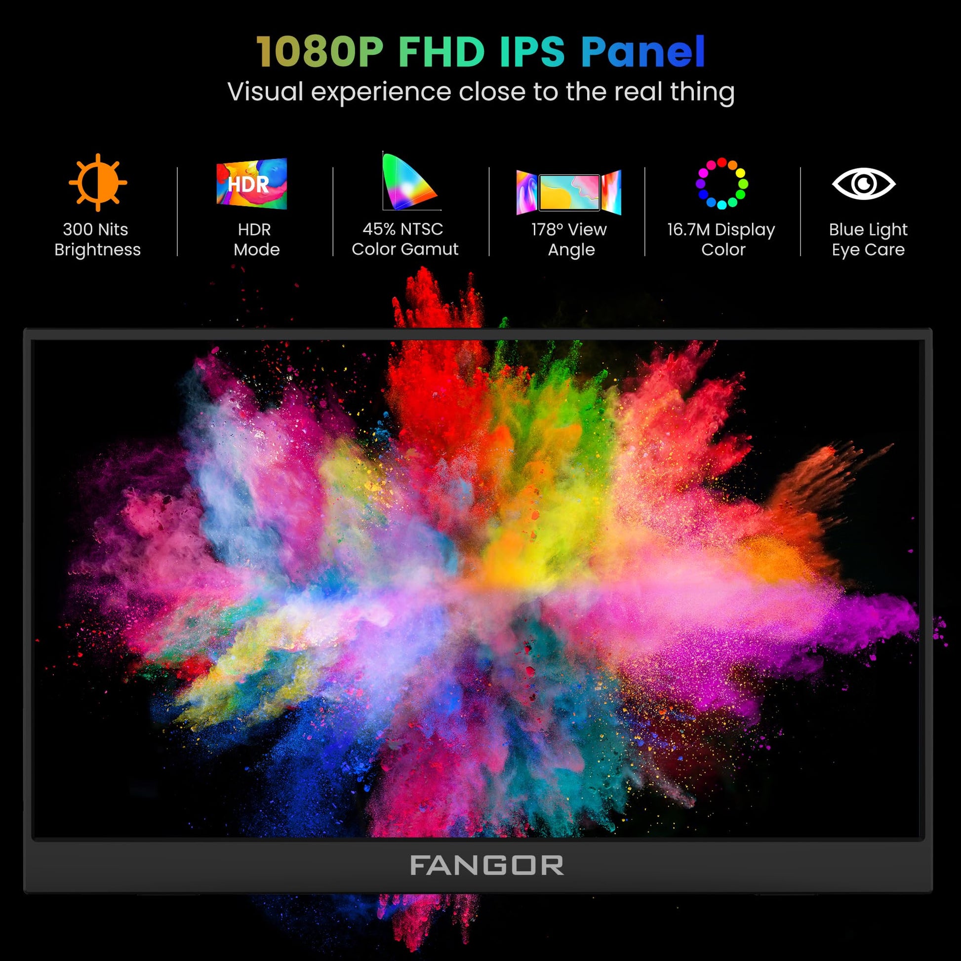 - 🌈Full HD 1080P IPS Display: Fangor 15.6-inch portable display adopts an advanced IPS screen with a resolution of 1920 x 1080 and supports 178° all-round viewing angle, 60HZ refresh rate, FreeSync features. It can not only perfectly present accurate and bright colors, and display stunning details, but also reduce blue light radiation and protect eyes from visual fatigue, making it the best choice for home and travel monitors.