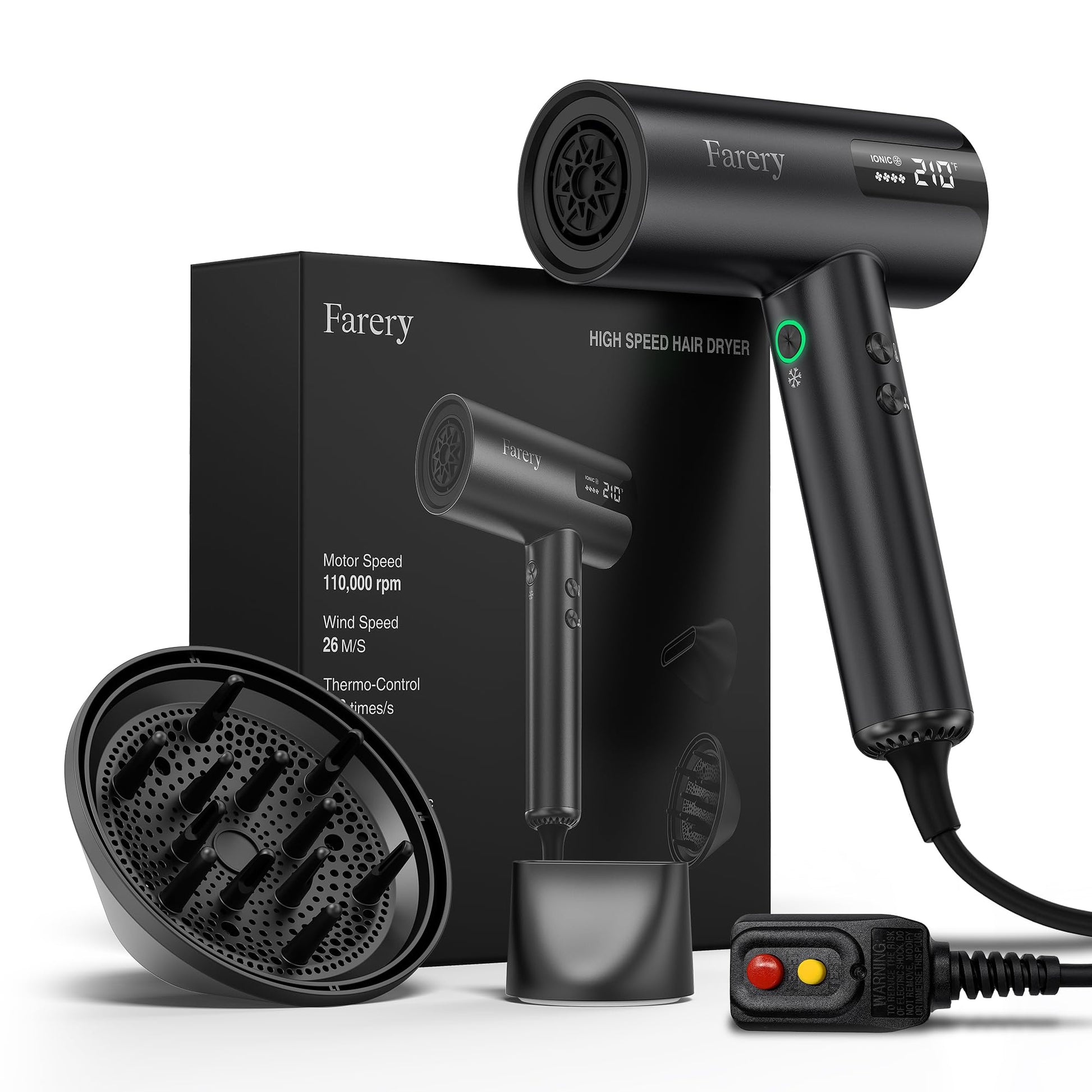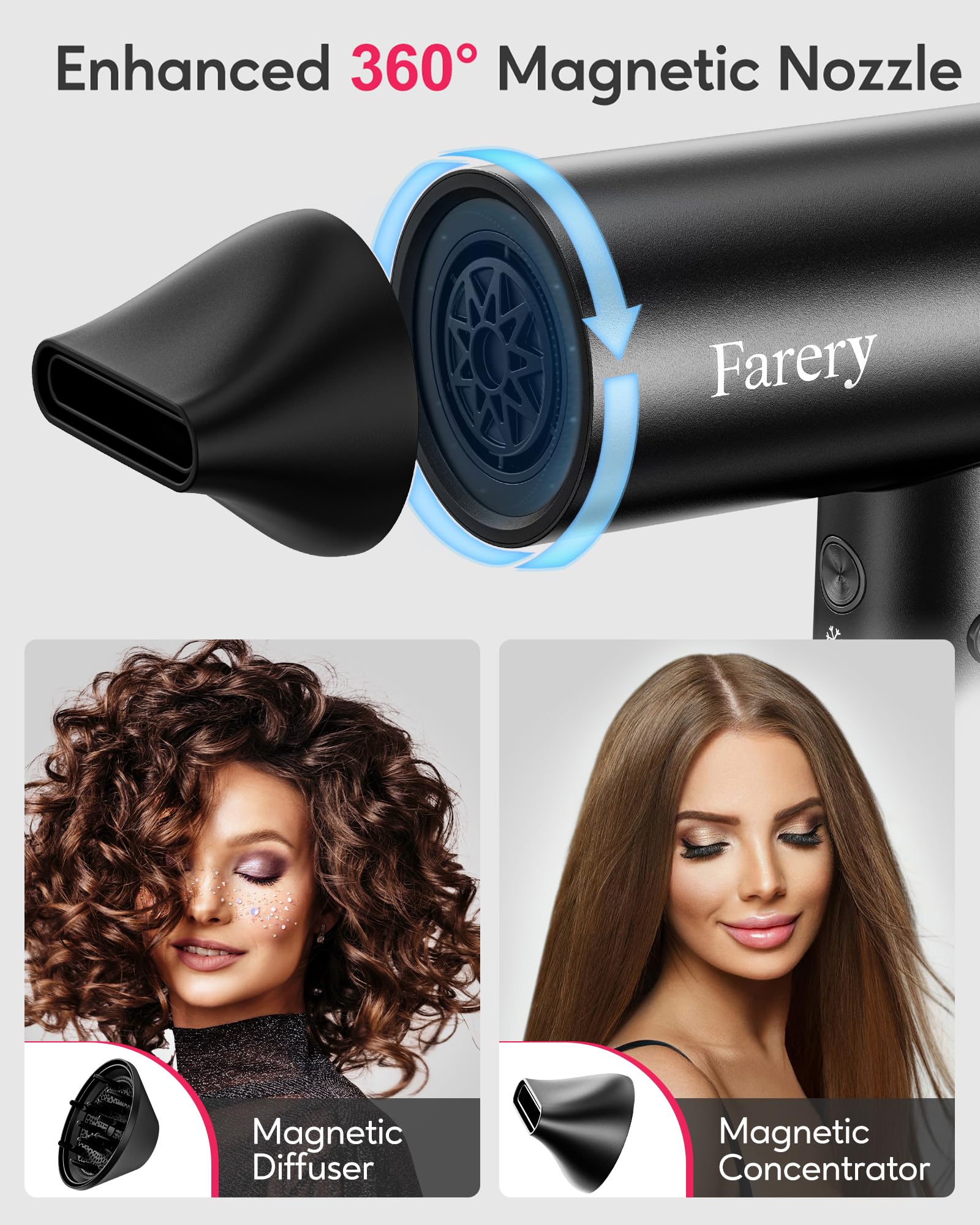- Magnetic Diffuser & Concentrator Included - Farery H8 Professional Hair Dryer comes with a Magnetic Diffuser for enhancing curls and reducing frizz, and a Magnetic Concentrator for precise airflow control. Both attachments snap on easily and stay securely in place
