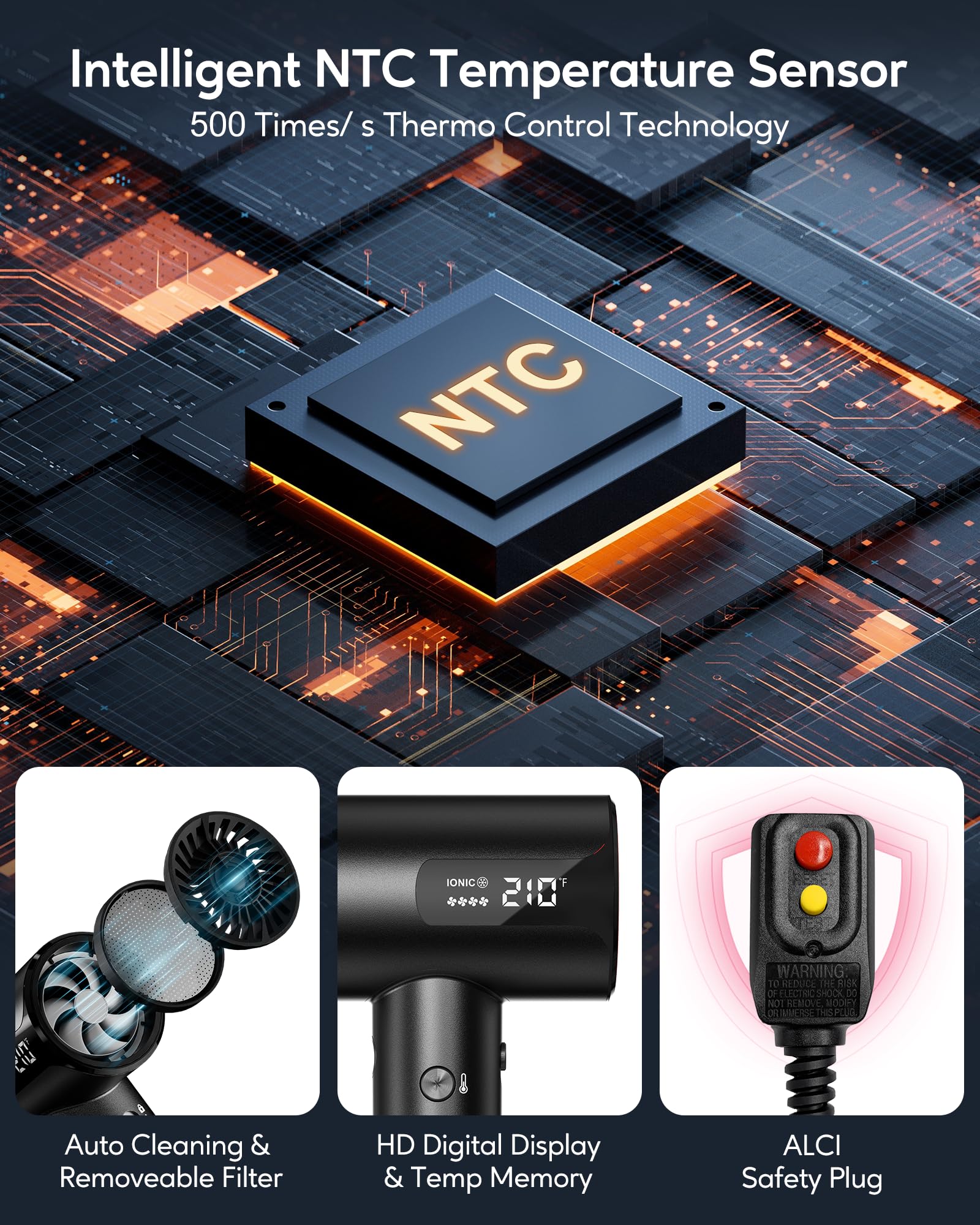 - 500 Times/Second Thermo Control with NTC Chip - Farery H8 Professional Blow Dryer features advanced NTC chip technology, which regulates temperature 500 times per second. This precise thermo control enhances hair protection, ensures efficient styling, and delivers professional-grade results, making it the perfect choice for salon-quality performance at home