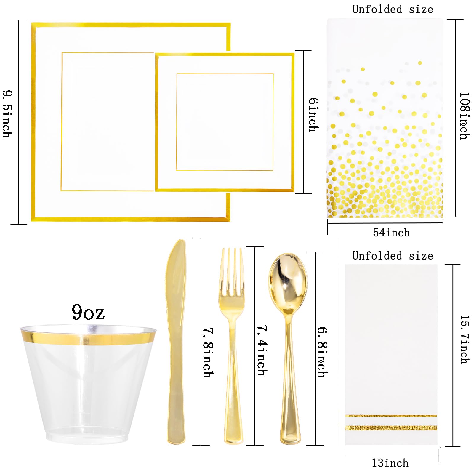 - VERSATILE VALUE SET:The party plates and cups and napkins sets includes gold plastic plates, cutlery, cups, 54*108 inches (unfolded size) tablecloth and 13*15.7 inches (unfolded size) napkins. Whether it's a family gathering, wedding, birthday party or corporate event, this disposable plates will meet your dining needs and simplify your preparation.