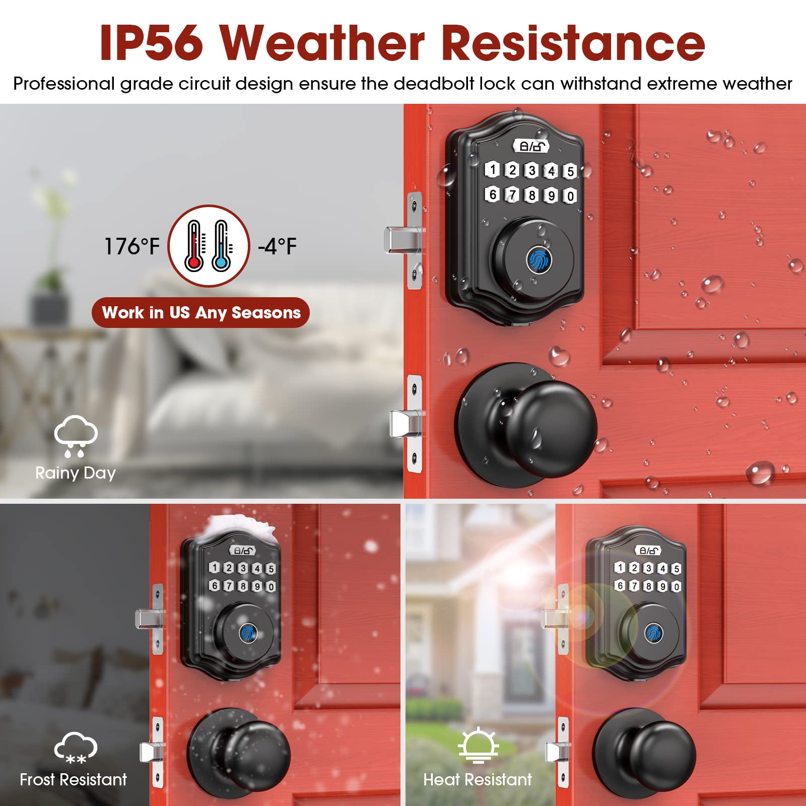 Fingerprint Deadbolt Lock for Door, Keypad Deadbolt Front Door Lock Set with Passage Door Knob, Digital Electronic Door Lock with Code/Fingerprint/Key, IP65 Auto-Lock Door Locks for Front Door