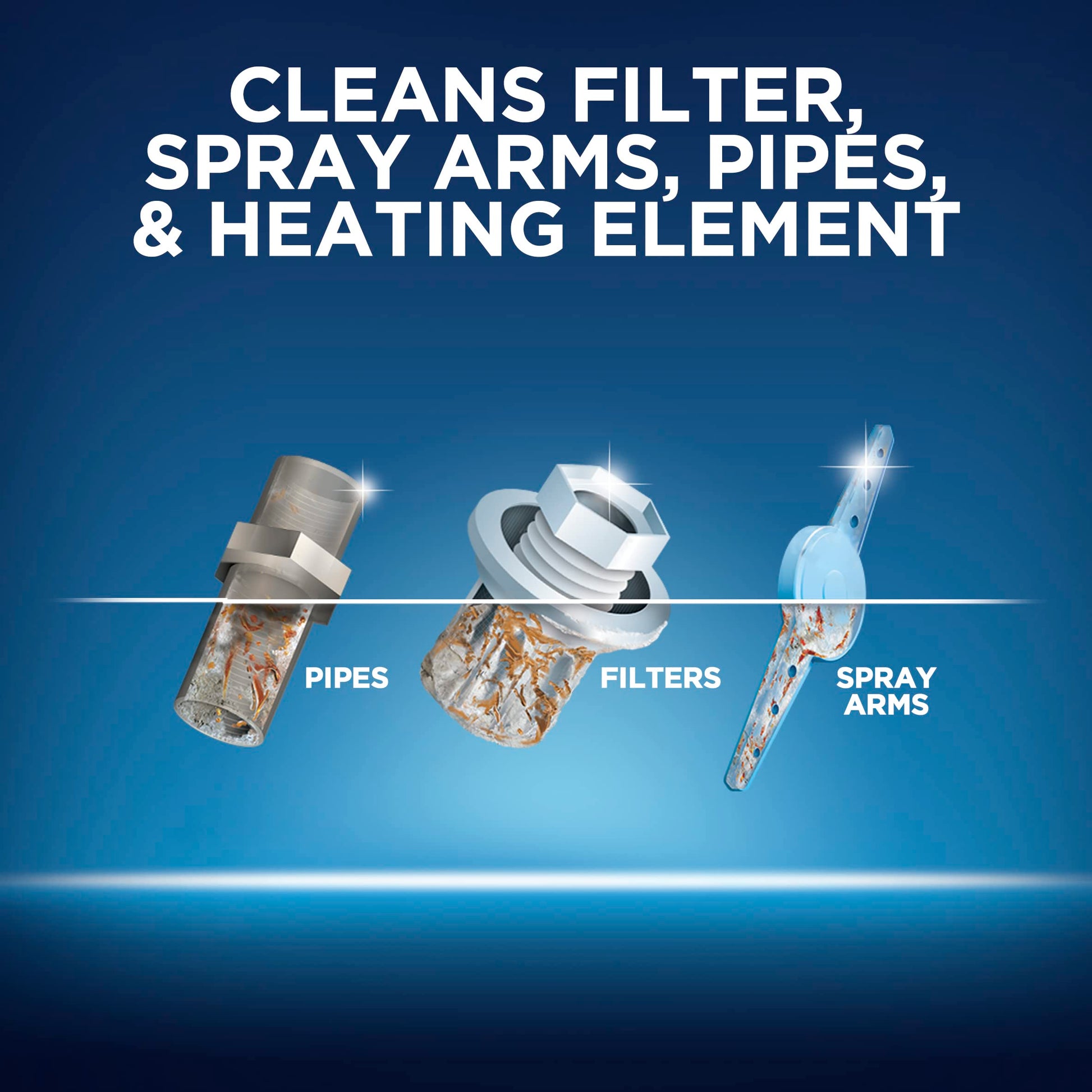 Finish dishwasher cleaner works by safely and effectively breaking down and removing mineral build-up inside your dishwashing machine, including hard-to-reach parts like the heating element and sprayer arms.