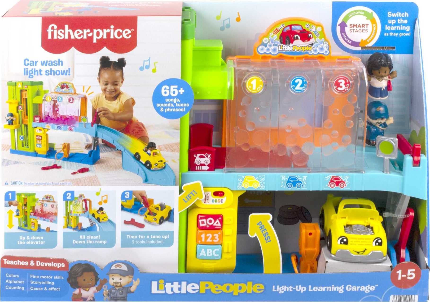 Details: At the Fisher-Price Little People Light-Up Learning Garage playset, toddlers can “fill” up, tune up and “wash” their car before racing along to the next adventure! This interactive car garage playset features multi-color lights and 3 Smart Stages learning levels of songs, sounds and phrases to enhance your child’s pretend play. Kids can act out fun stories with 2 character figures, 2 mechanic’s tool play pieces, and a push-along toy car with a hood they can open and close.